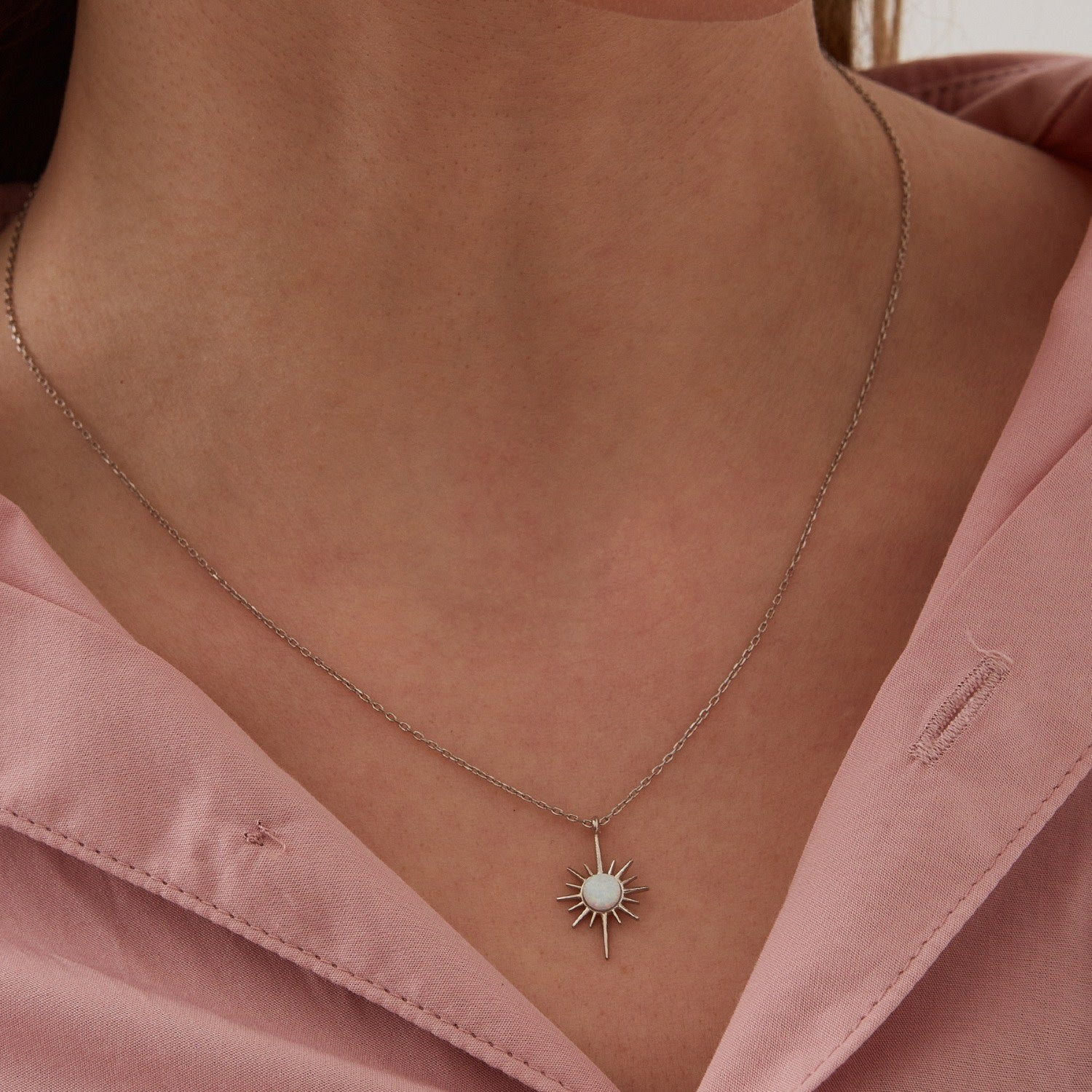 This White Opal Northernstar Sterling Silver Pendant Necklace - Silver by Spero London is a beautiful and elegant accessory. Skillfully crafted with intricate detail, the sterling silver chain and handcrafted setting feature a lustrous white opal in a northern star design. It's a timeless and understated accessory perfect for any occasion.