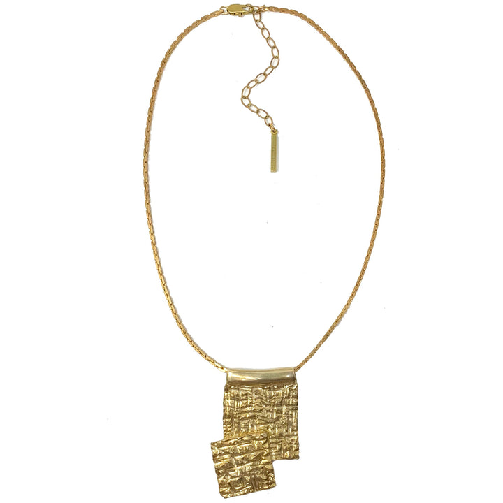 The Hutton Necklace by Castlecliff is the definition of effortless glamour. The centerpiece is a pendant with a textured metal surface that creates a subtle sparkle. The aesthetic is modern and sophisticated, offering a clean, simple look that is versatile for any occasion. The necklace is handcrafted in NYC from 100% recycled brass, making it a sustainable and ethical choice. With wear, the brass will achieve a rich patina, adding to its unique character.