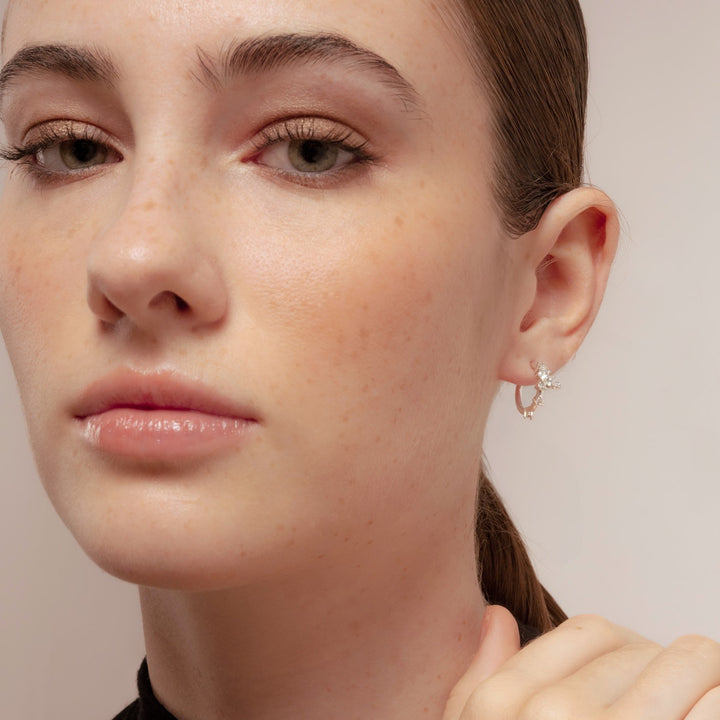 These Silver Orchid Flower Hoops by Lavani Jewels are an elegant and discreet accessory. They are part of the Bridal collection and are perfect for brides or anyone who covets a simple and minimalist look. These small silver hoops are decorated with delicate white zircons, and are hypoallergenic and nickel-free.