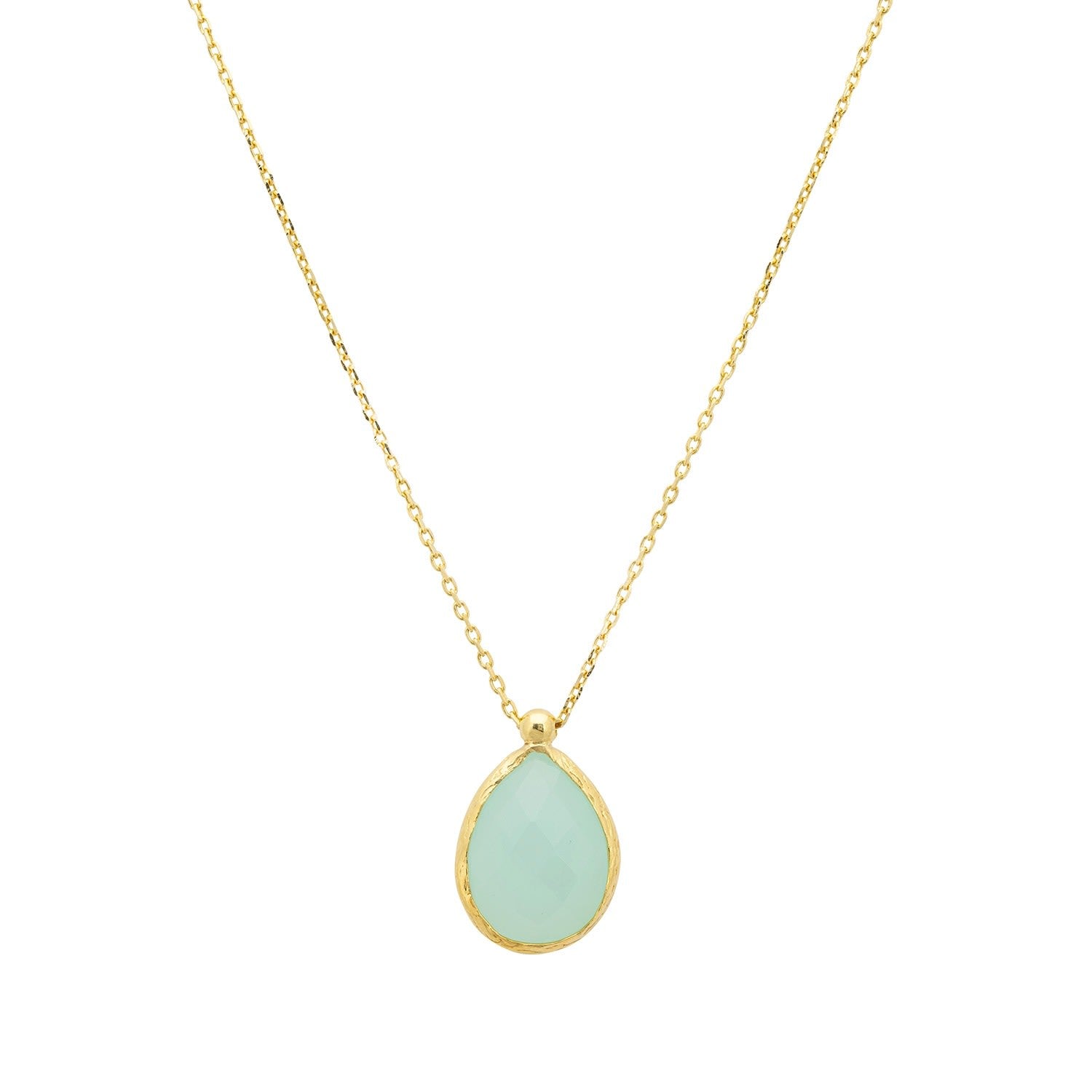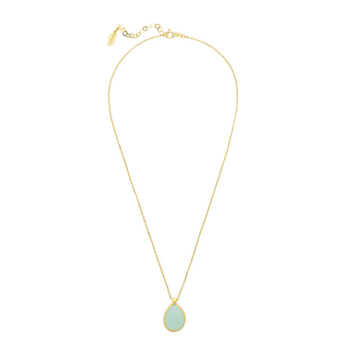 This necklace is made from 925 sterling silver dipped in 18ct gold and features a teardrop-shaped Aqua Chalcedony gemstone. The stone size is 1.7cm x 1.4cm.