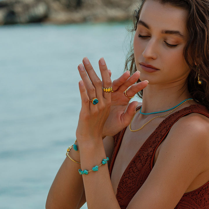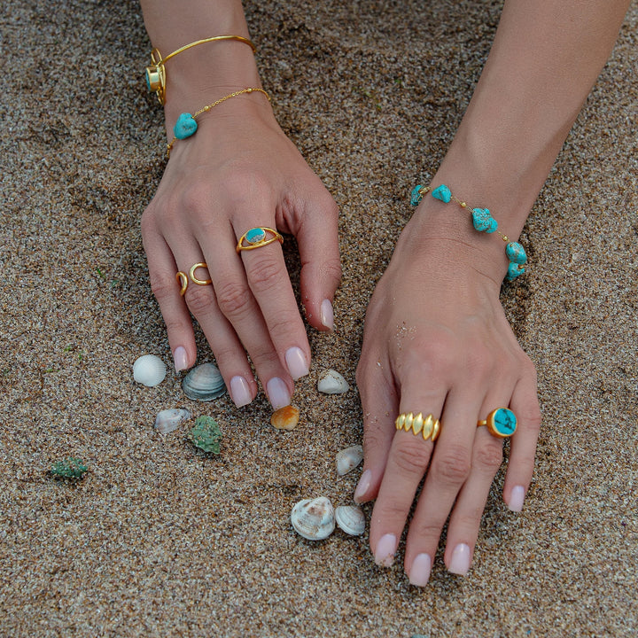 This Multiple Turquoise Gemstone Chain Gold Bracelet by Mejoma is a stunning and unique accessory. This one-of-a-kind piece features multiple turquoise gemstones intricately set on a delicate gold chain, creating a bold and eye-catching look. The natural irregularity and imperfections of each gemstone are celebrated, adding to the bracelet's unique charm and elegance.