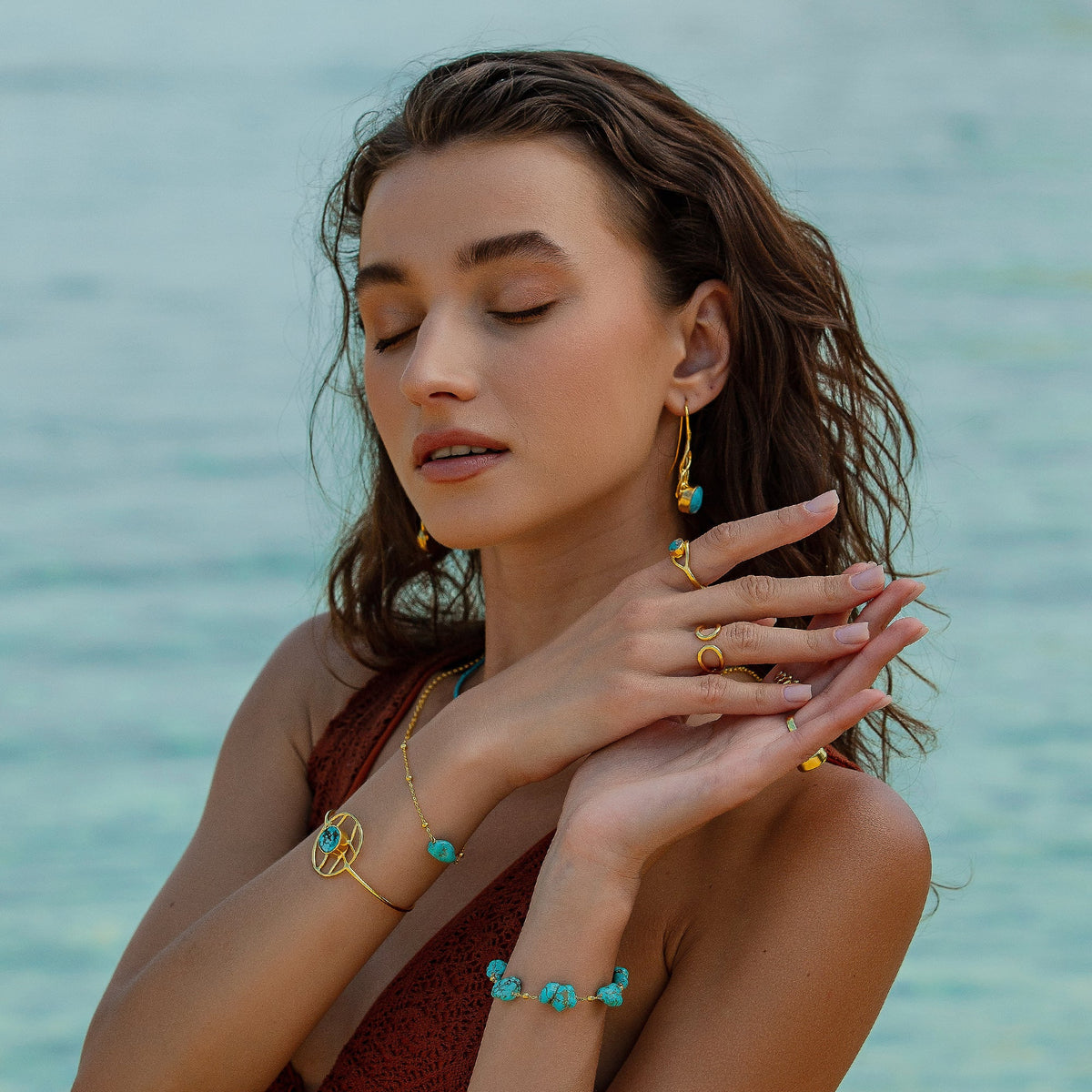 This bracelet features multiple natural turquoise gemstones set on a gold chain.