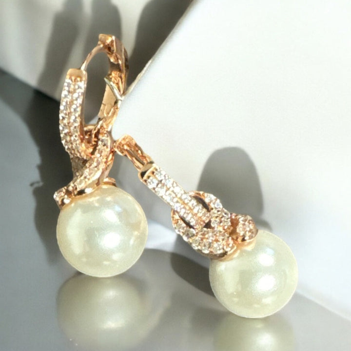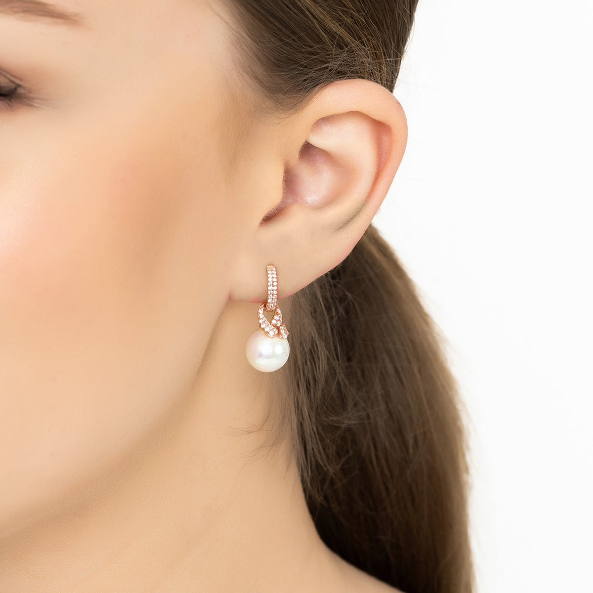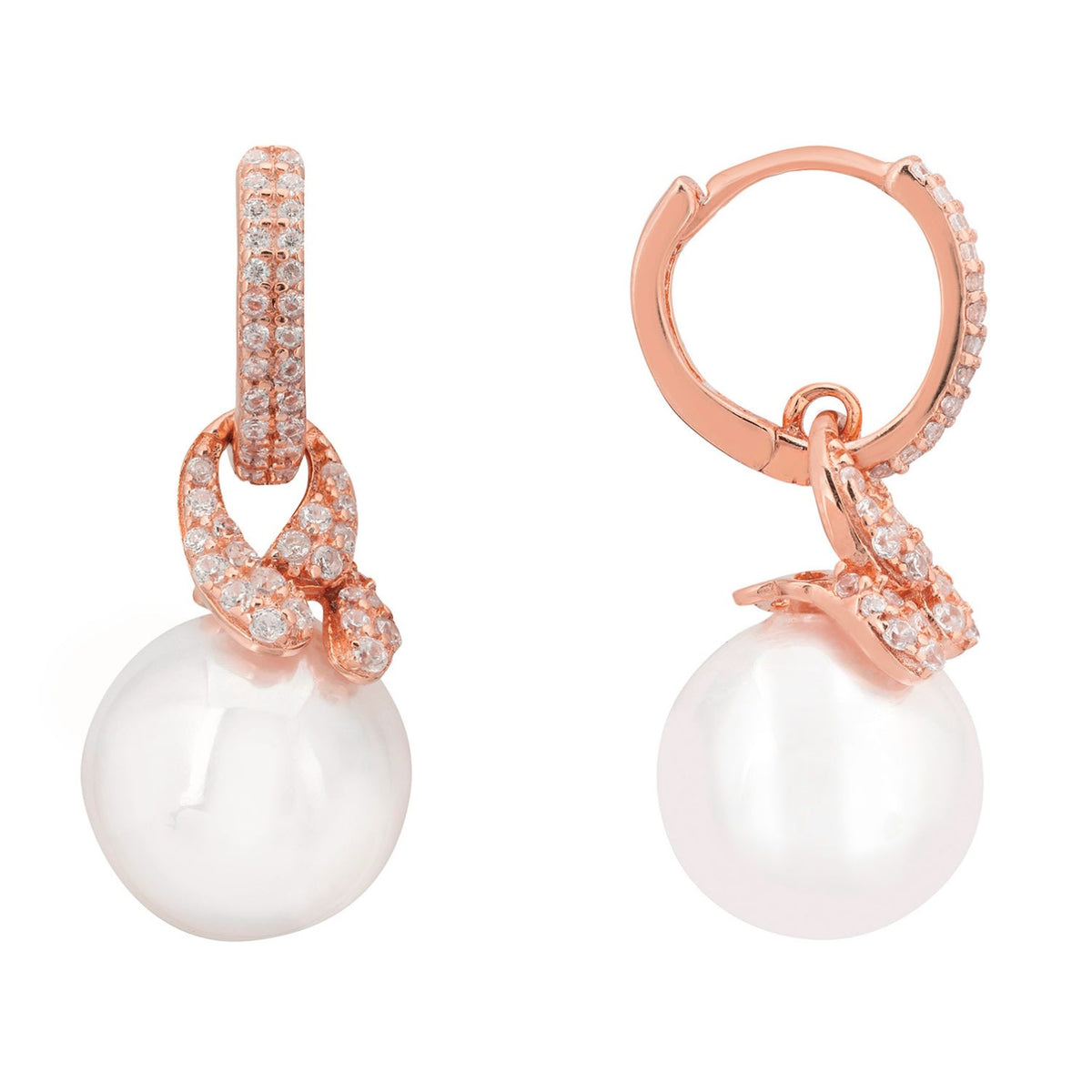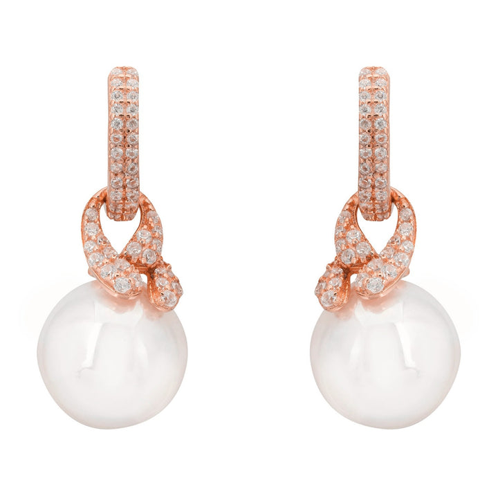 These earrings are handcrafted from 925 sterling silver and dipped in 18ct rosegold. They feature a cubic zirconia-adorned hoop, a knot design, and a pearl drop.