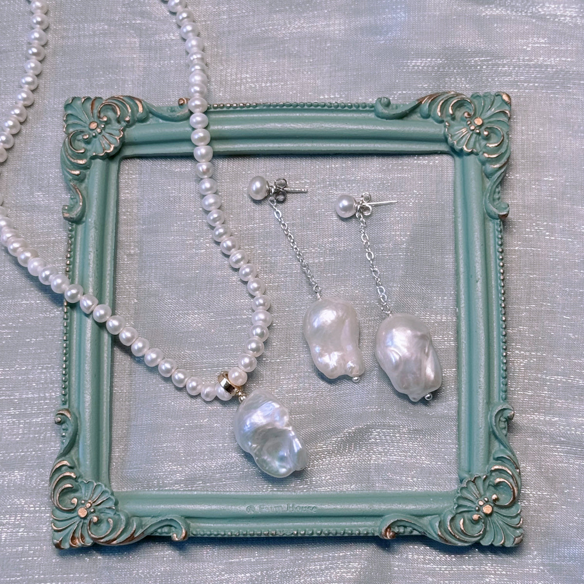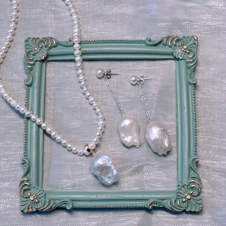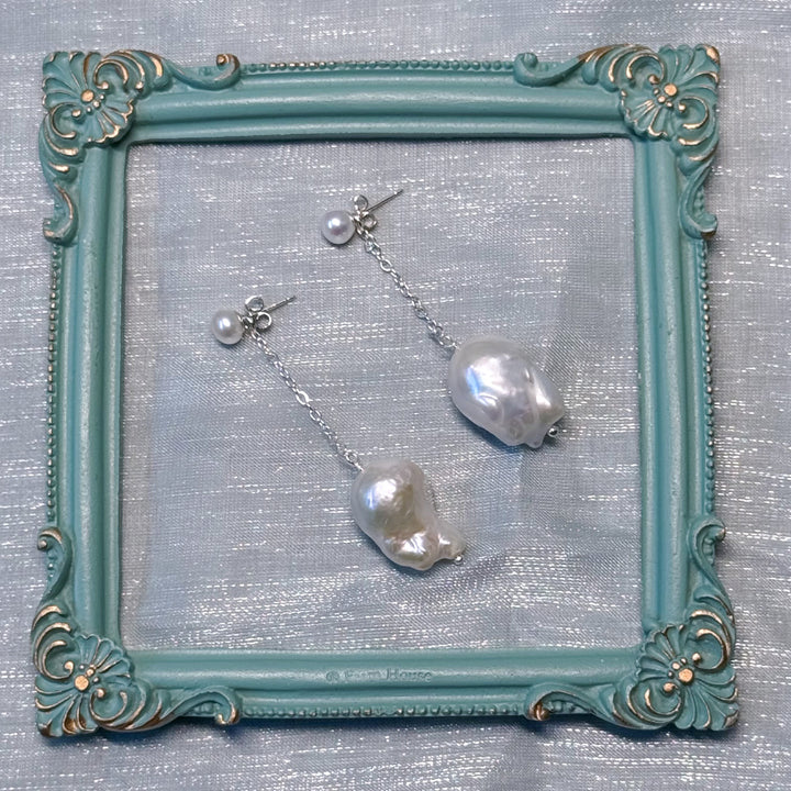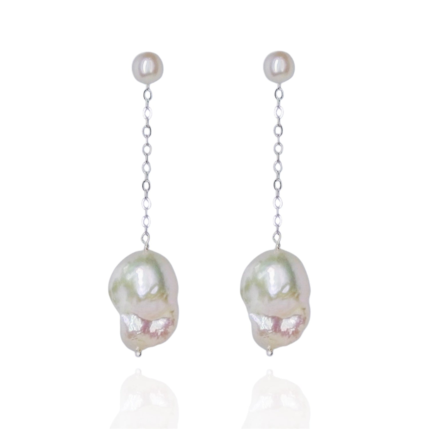 These earrings are crafted from 925 silver and feature a baroque pearl. The pearl is detachable from the sterling silver chain.