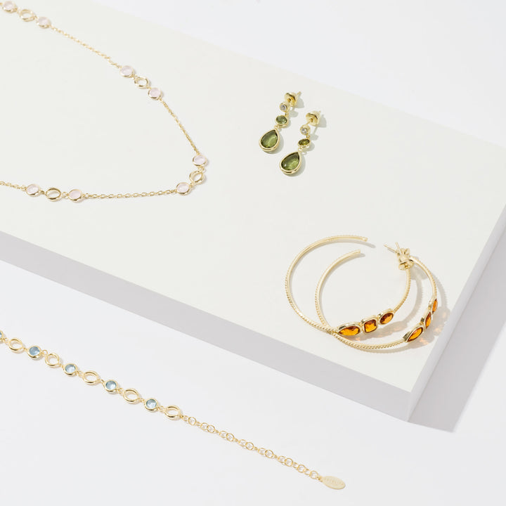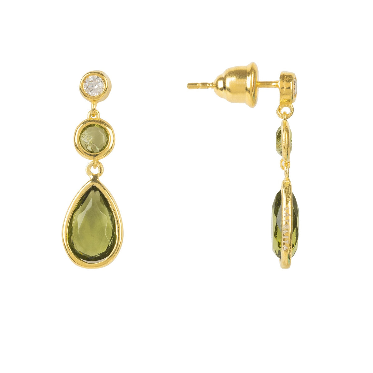 These Tuscany Gemstone Drop Earring Gold Peridot by Latelita are a delicate and elegant accessory. They feature two graduated teardrop Peridot gemstones suspended from a small cubic zirconia sparkly top. The earrings are made from 925 sterling silver and are dipped in 22ct gold. They are inspired by the Italian Riviera and are a perfect way to add a pop of color to your attire.