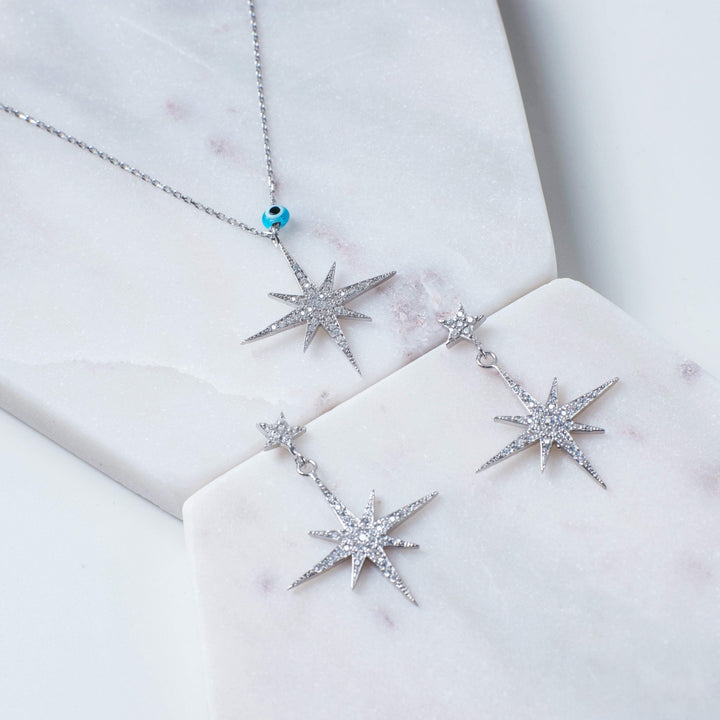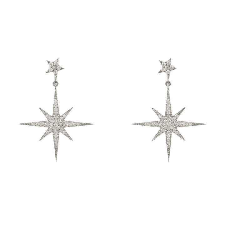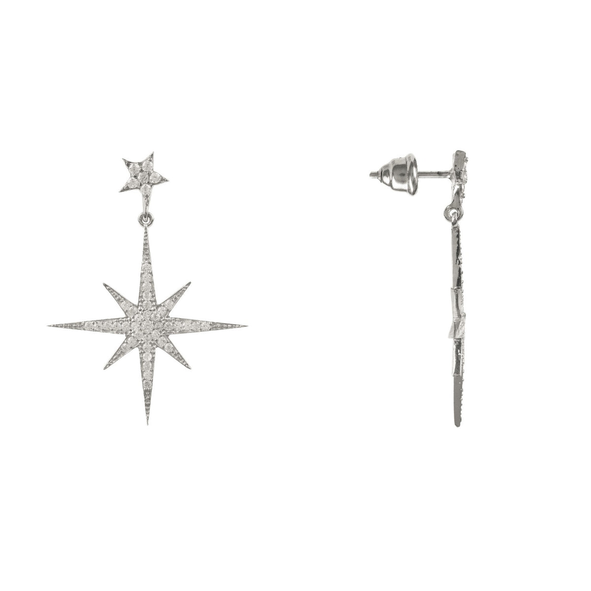 These Petite Star Burst Drop Earring Silver by Latelita are a dazzling accessory that adds glitz and glam to any outfit. A smaller stud-backed starburst is connected to a larger hanging starburst, creating beautiful movement as you wear them. Made from 925 sterling silver and handset with micro pave AAA grade cubic zirconia, these earrings sparkle like a supernova.