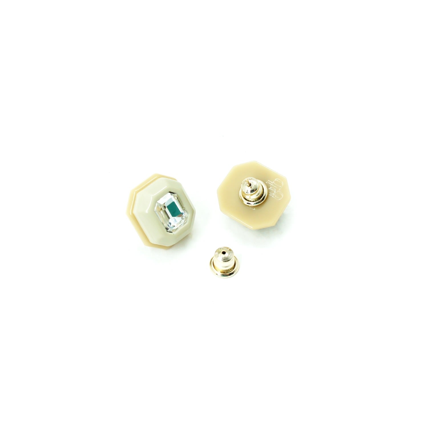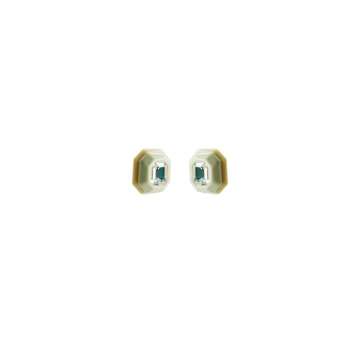 These short earrings are handmade by Brazilian artisans. They are made of acrylic with an octagonal glass stone and gold-finished metals.