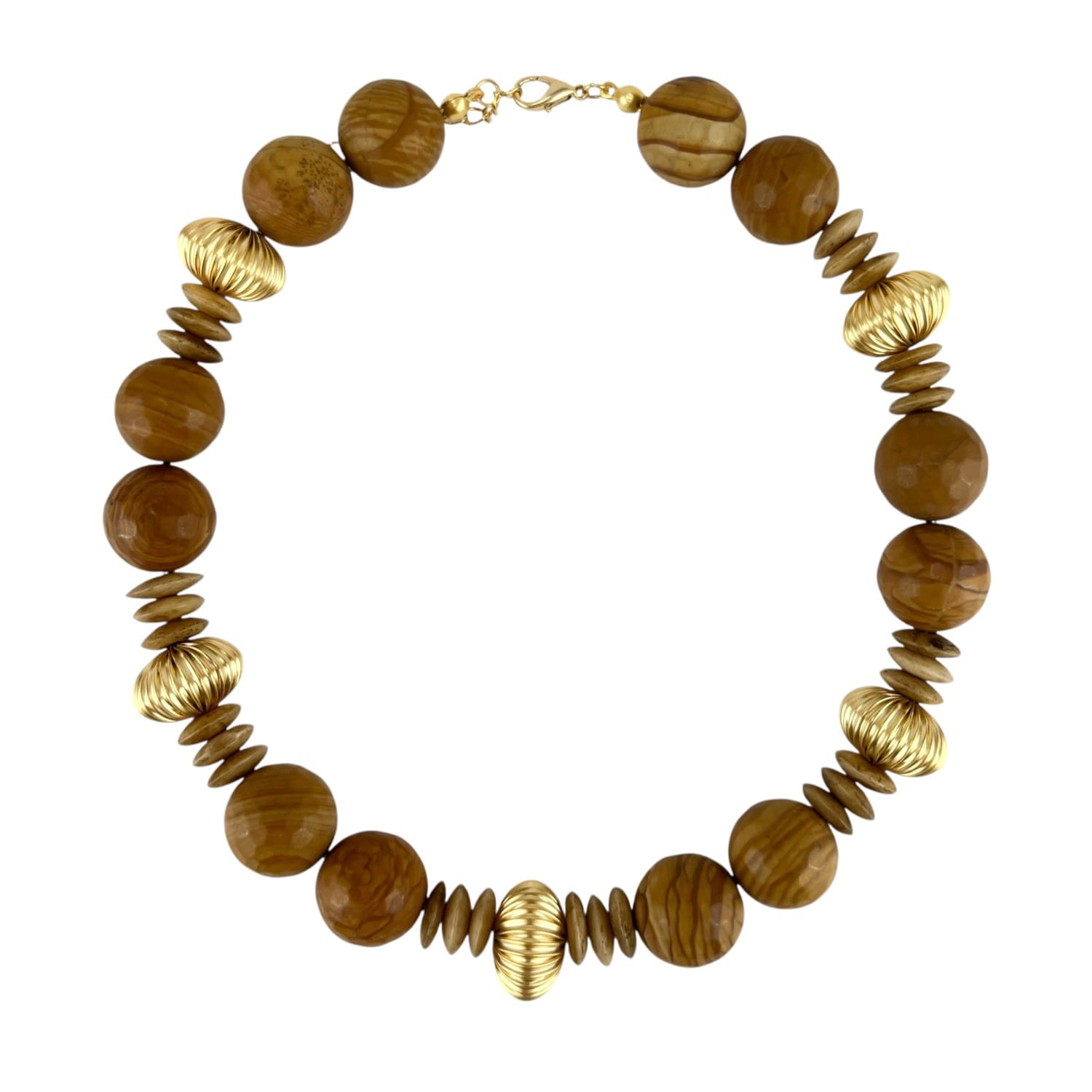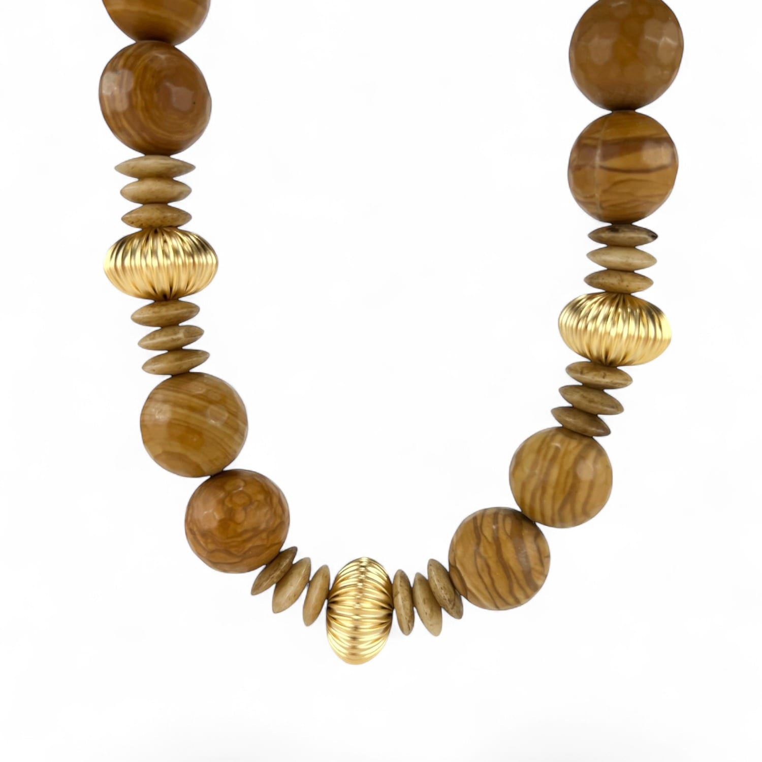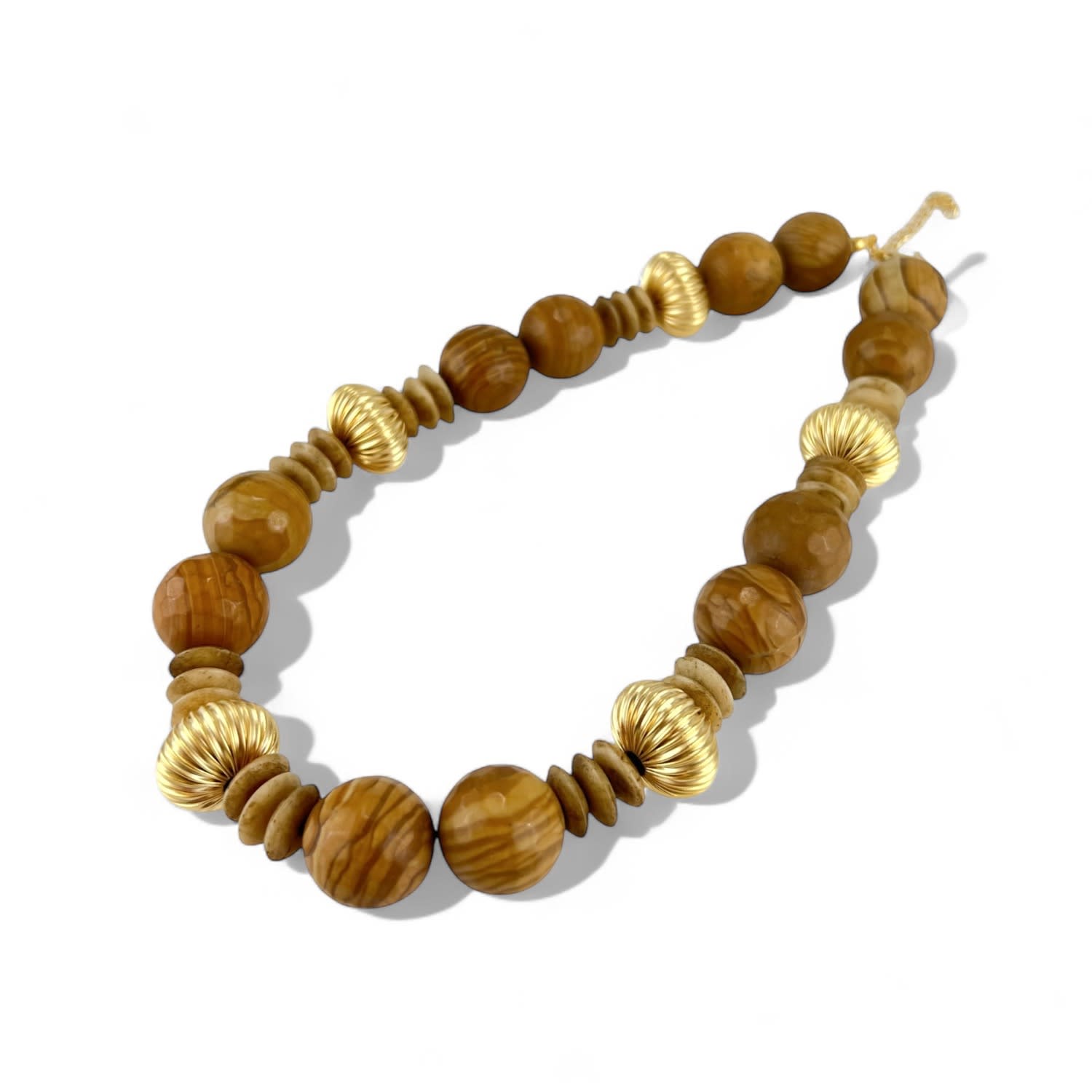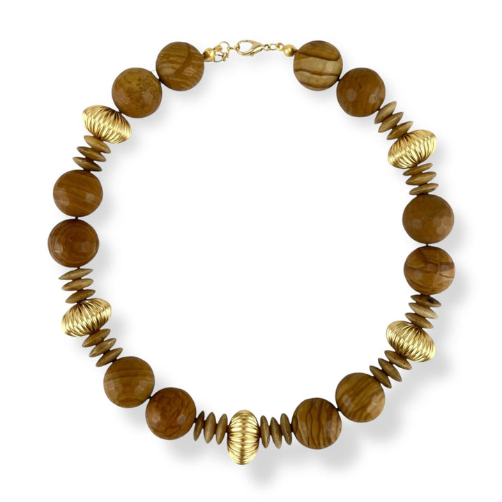 This handcrafted necklace is made from natural jasper stones, African bone beads, and gold-plated brass.
