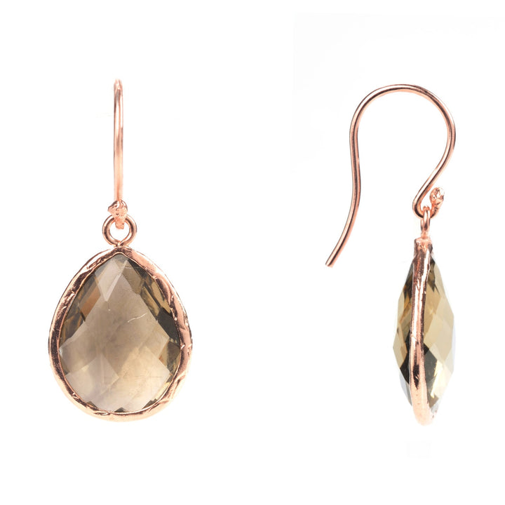 These earrings are crafted from 18ct rose gold plated sterling silver. They feature multi-faceted smokey quartz hydro crystals and a french hook closure.