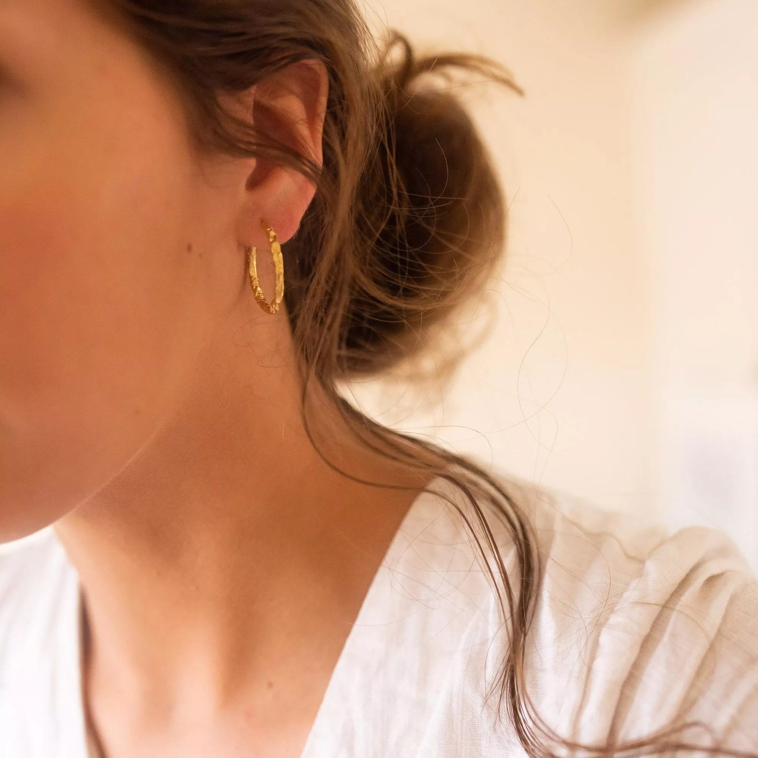 These Medium Gold Thin Hoop Earrings by Elk & Bloom are a perfect, subtle accessory for adding a little sparkle. The earrings are made of solid sterling silver and coated in genuine 14k gold plating. They feature an irregular, textured, open circle hoop design, giving them a unique charm. At approximately 26.5mm in diameter, they are a great medium size for everyday wear.