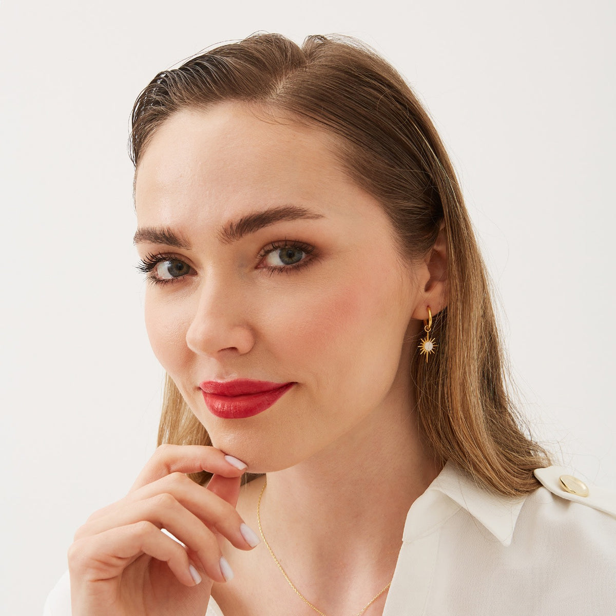 White Opal Northern Star Starburst Drop Hoop Earring by Spero London captures the enchanting beauty of the night sky. Fashioned in 925 recycled sterling silver and plated in gold, these earrings feature a drop star shape with an elegant opal stone at the center. The hoop style and gleaming silhouette make you look fascinated, just like a twinkling star. The hinged-back lock ensures a secure fit, allowing you to go out in style.