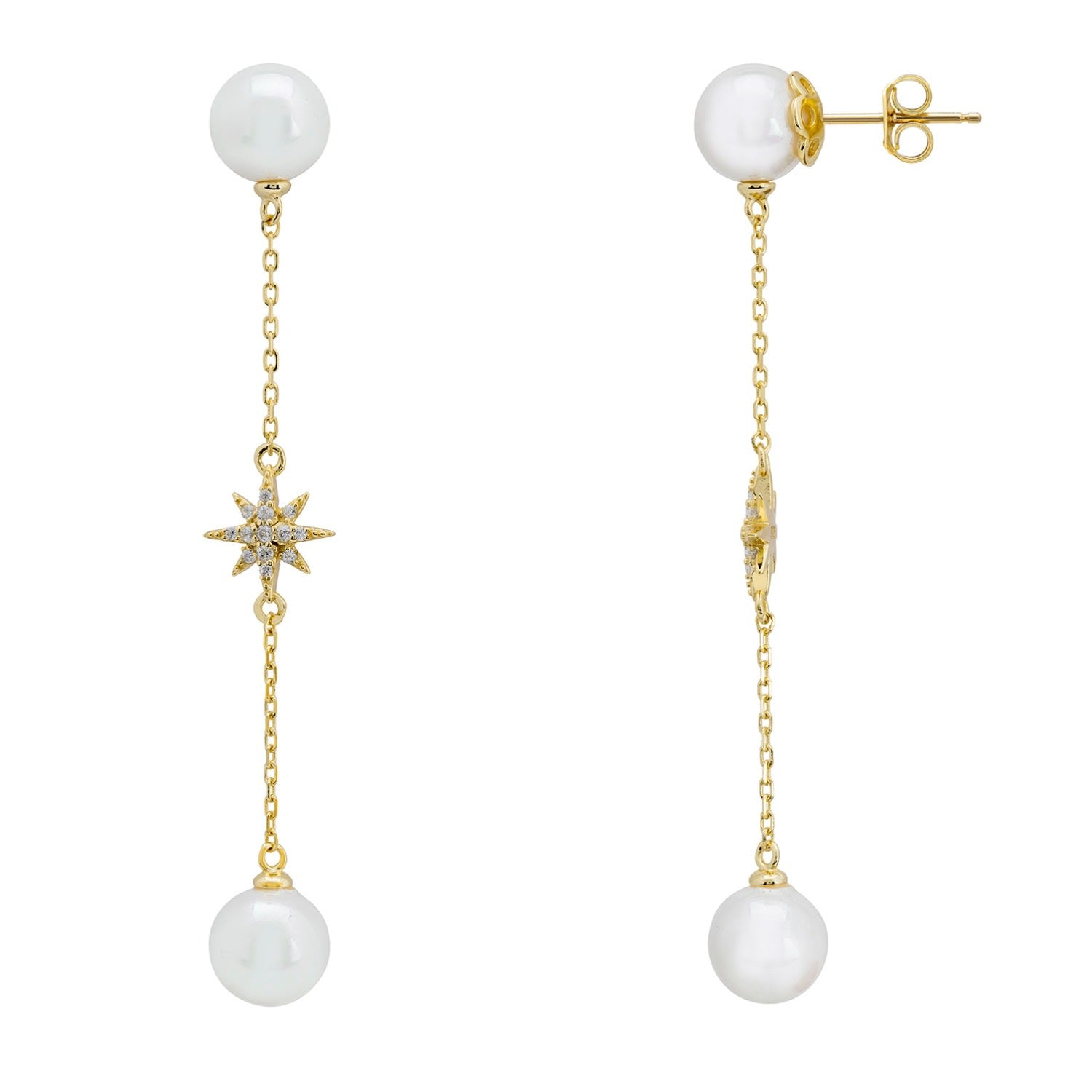 These earrings are handcrafted from 925 Sterling Silver, dipped in 18ct gold, and feature two Majorica Pearls and cubic zirconia gemstones.