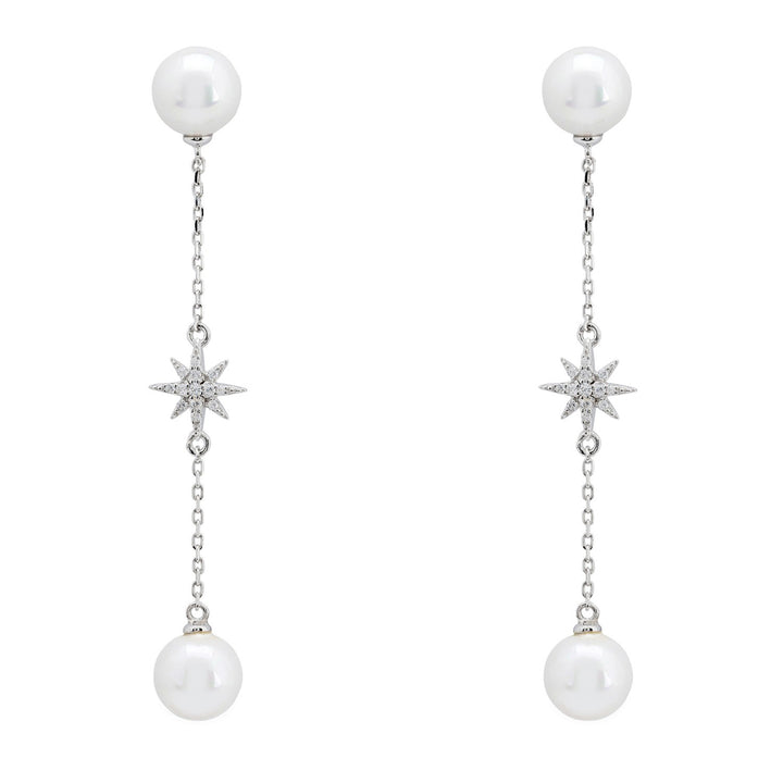 These Falling Star Pearl Drop Earrings by Latelita elevate your style with a celestial and elegant aesthetic. They showcase two lustrous pearls—one on the earlobe and one gently swinging from a fine chain. A star, encrusted with sparkling cubic zircons, adds a touch of shimmer and whimsy. Pearls symbolize purity, wisdom, and serenity, while the star represents light and endless possibilities. Perfect for bridal looks or as a chic accessory to elevate your daily style with a touch of sophisticated wonder.