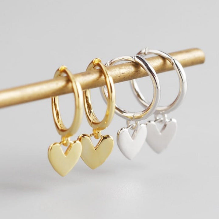 These hoop earrings are crafted from sterling silver and have been plated with 14k gold. The hoop measures approximately 11.5mm, and the heart is 6mm.