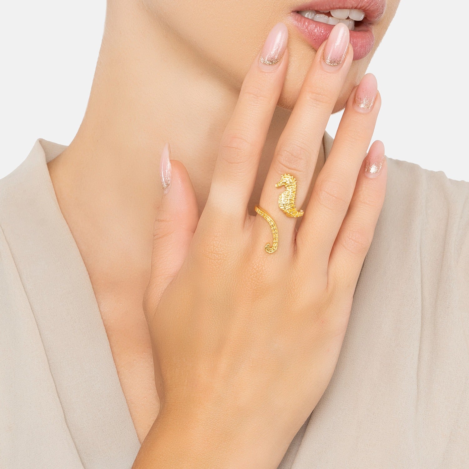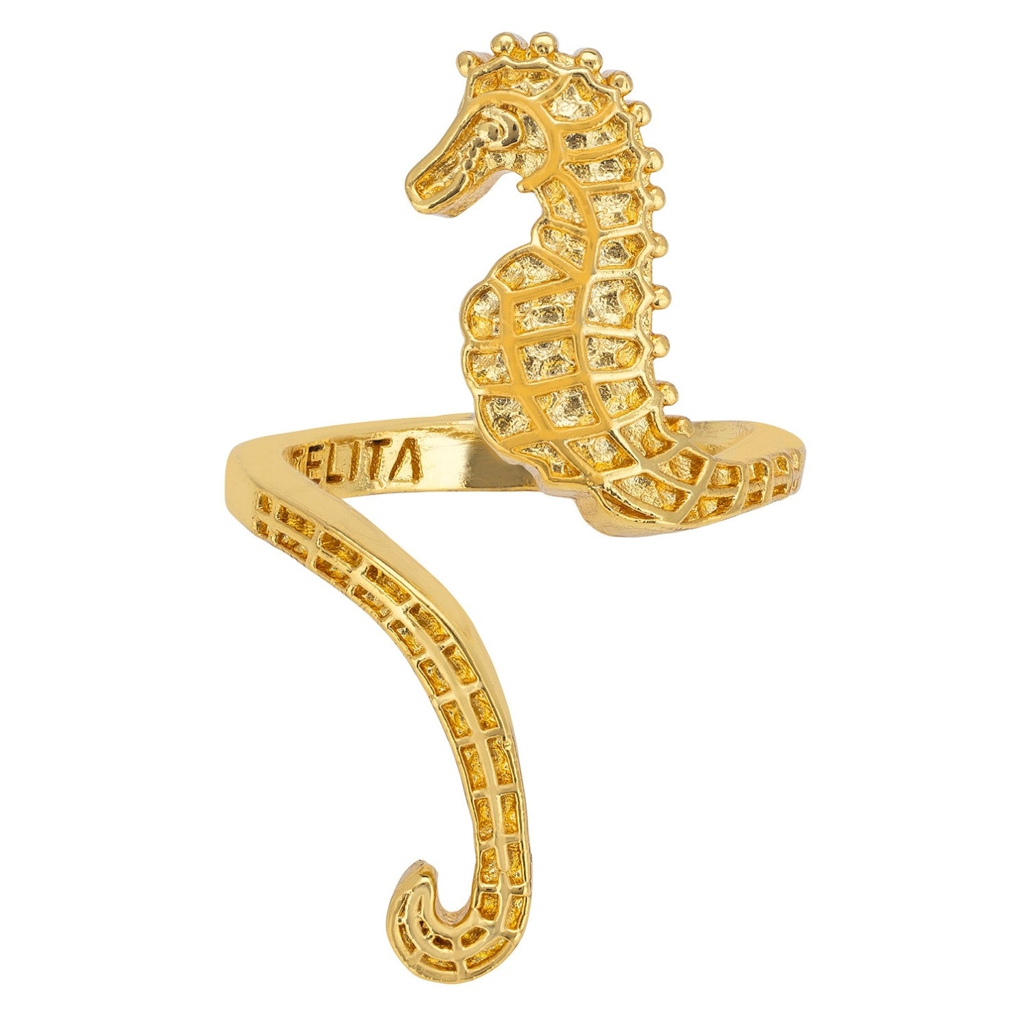 The Seahorse Wrap Around Adjustable Ring Gold by Latelita is a bold and elegant statement piece. This ring features a delicately sculpted seahorse that wraps around the finger, symbolizing patience, protection, and strength. It is slightly adjustable to fit various finger sizes. Handcrafted from durable brass and luxuriously plated in 22ct gold, it is also designed to be sweat and water-resistant.