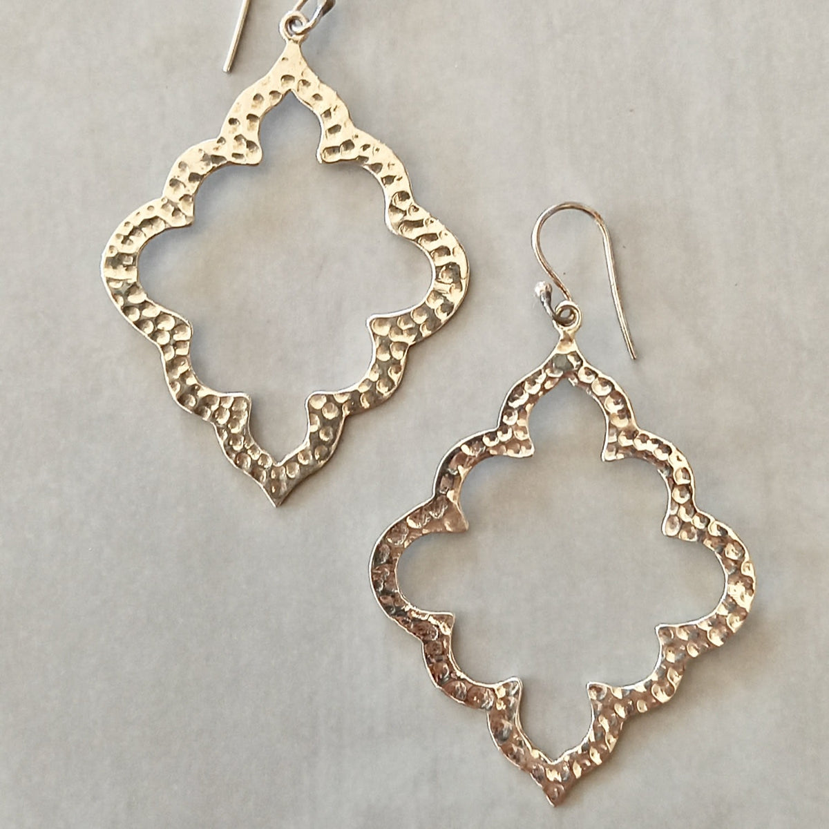 These earrings are handmade from 100% recycled sterling silver and have a hand-hammered design. They measure 52mm x 40mm with the bail.