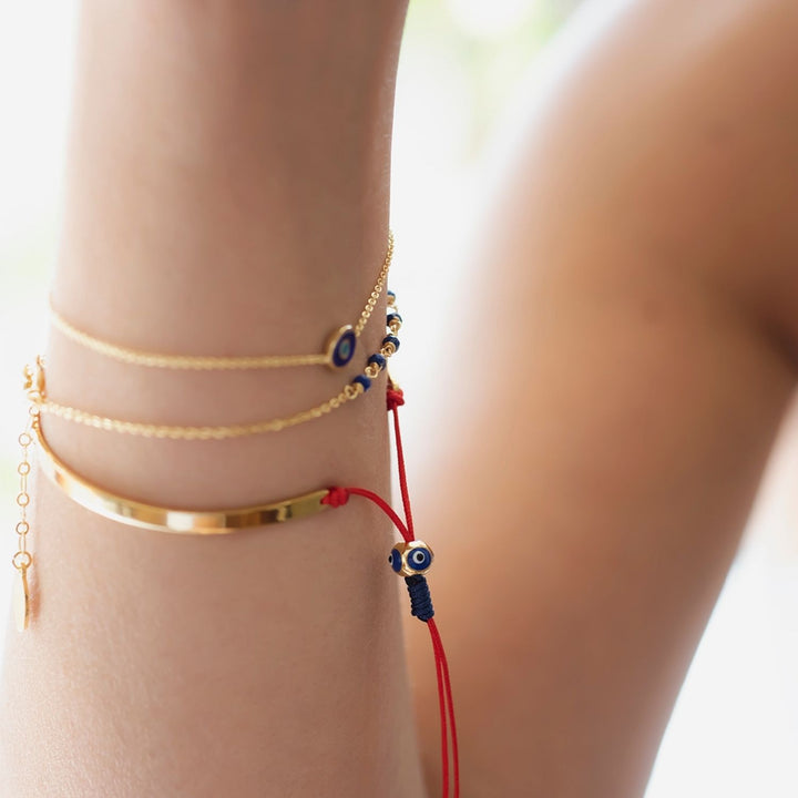 This cuff bracelet is made from 24K micron gold-filled brass and features evil eye beads.