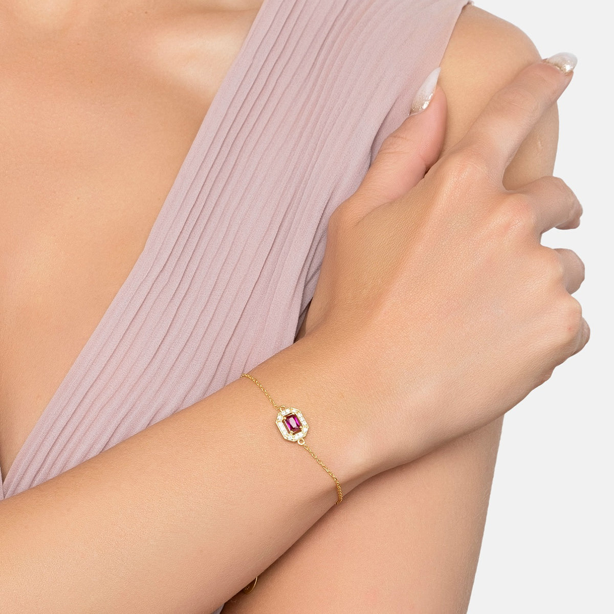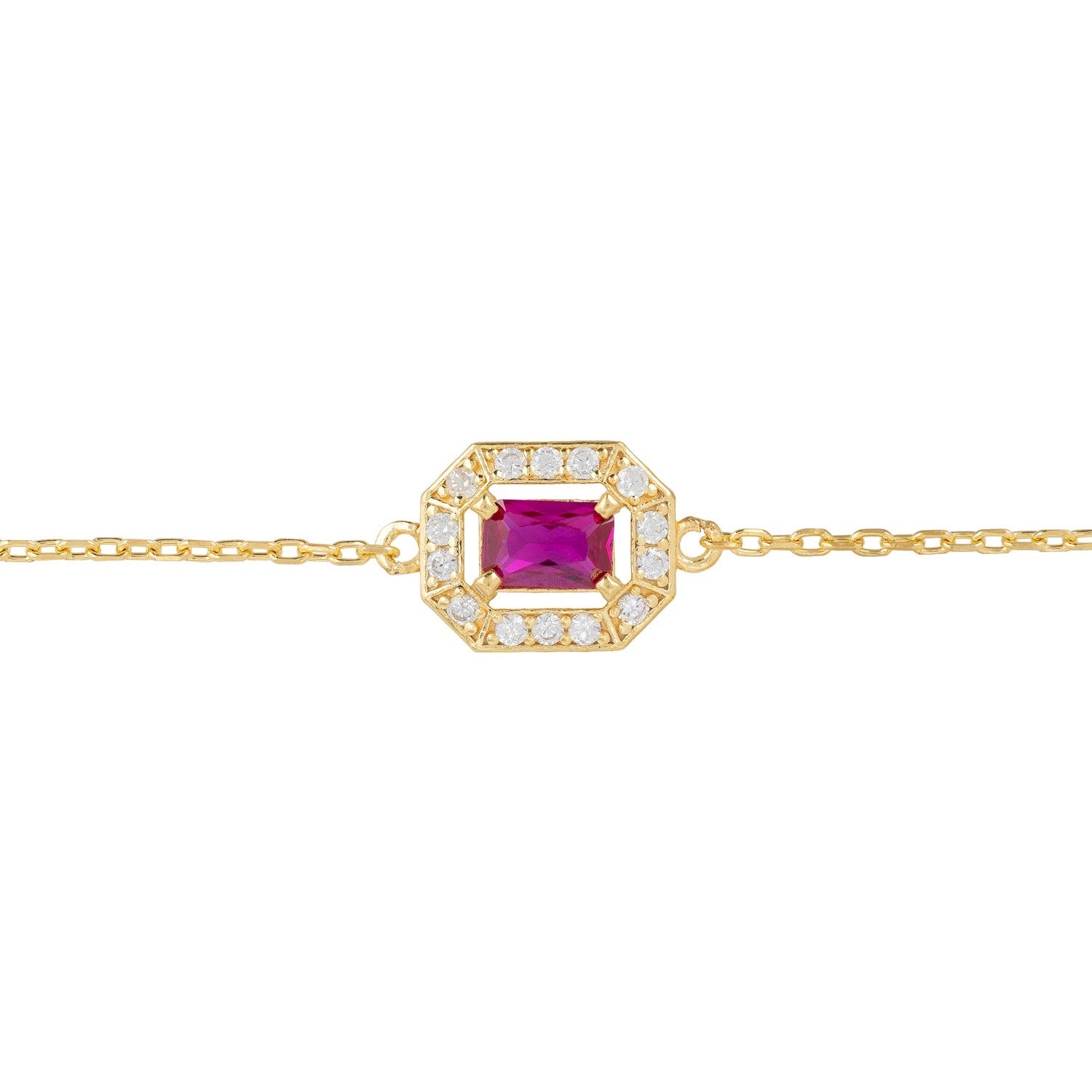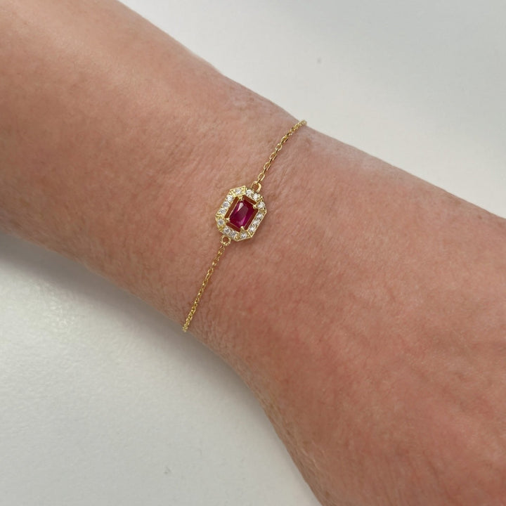 This bracelet is handcrafted from 925 Sterling Silver dipped in 18ct gold. It features a lab-grown ruby gemstone and cubic zirconia.