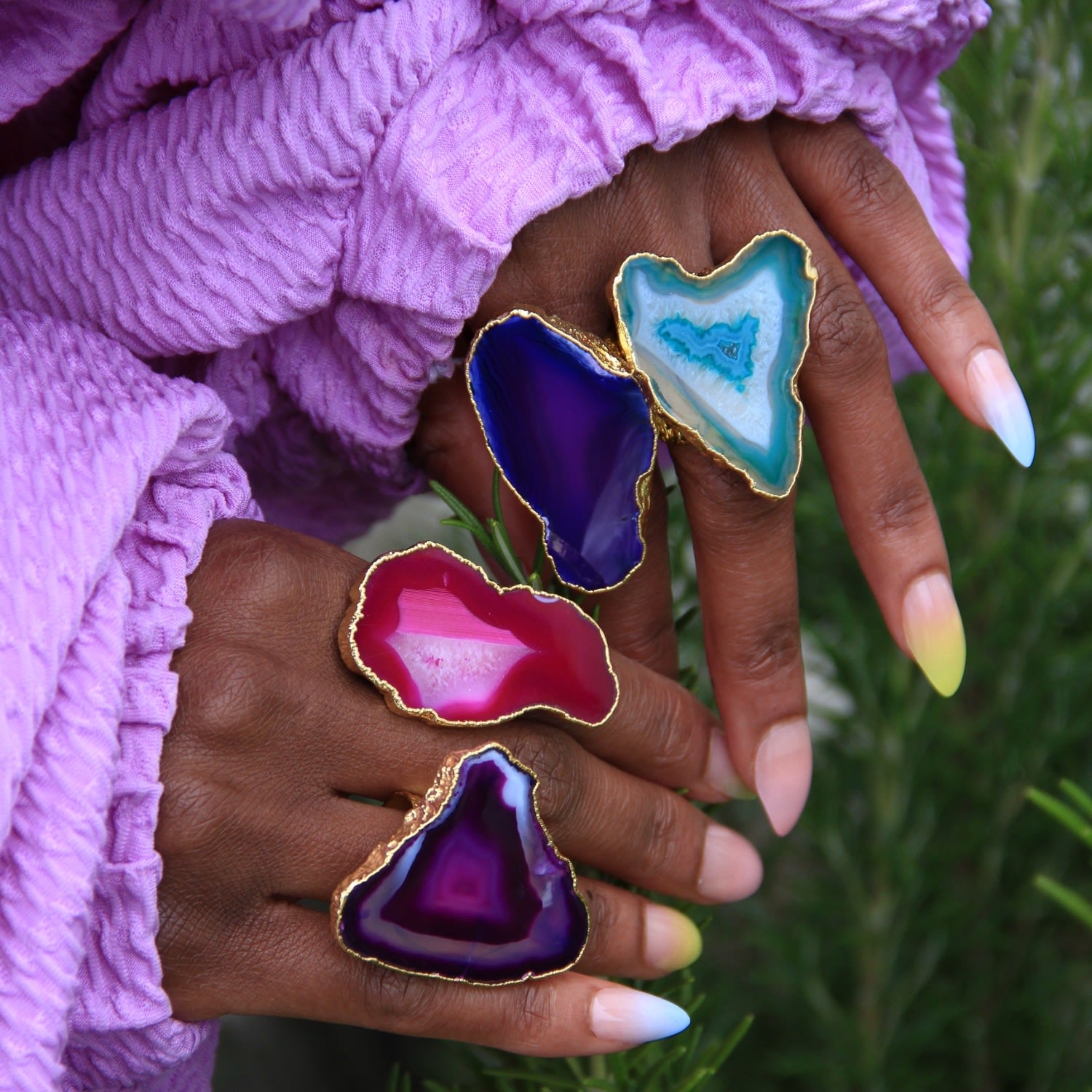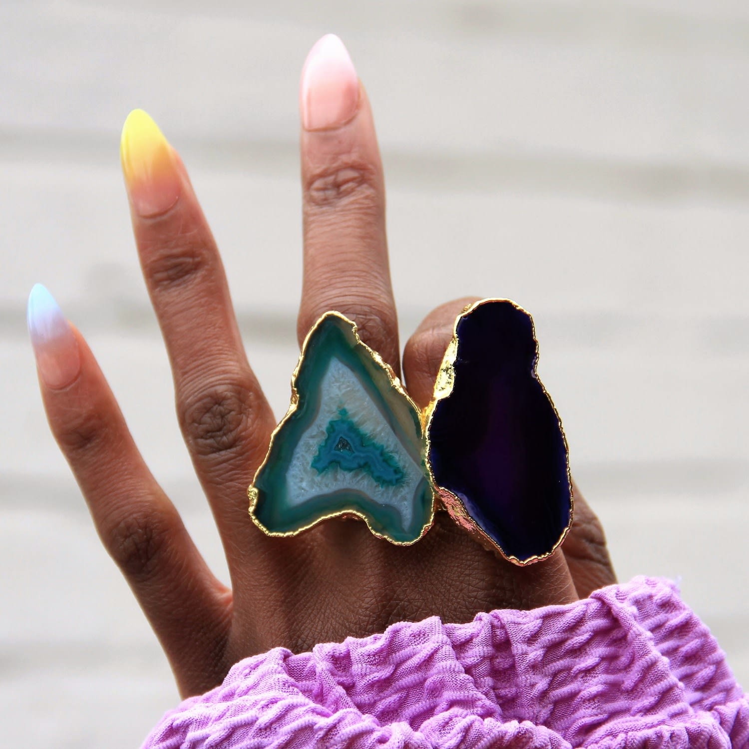 Handmade with natural agate stone, 18K gold, and brass. Adjustable design. Each stone unique in shape, size, and color.