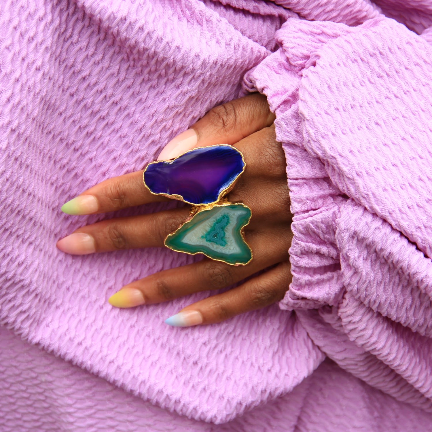 This Ultra Mega Green Gemstone Gold Statement Ring by Yaa Yaa London is a bold ode to natural beauty. Featuring a one-of-a-kind green agate, each oversized stone dazzles with unique tones and shapes. Adjustable and gilded in gold, it’s designed for those who embrace unapologetic statement style.