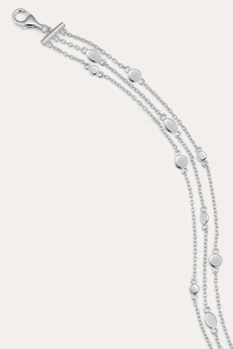This Simone Triple Chain Layered Bracelet In Silver by Vanchi is a chic and multi-layered bracelet handcrafted from sterling silver. The triple-layered chains are connected by beautiful oval dots, creating an elegant and subtle juxtaposition on the wrist. This piece is perfect for effortlessly upgrading your everyday wrist stack or for wearing solo to add a touch of timeless elegance. It embodies a refined and versatile aesthetic, making it a must-have accessory for those who appreciate classic style.