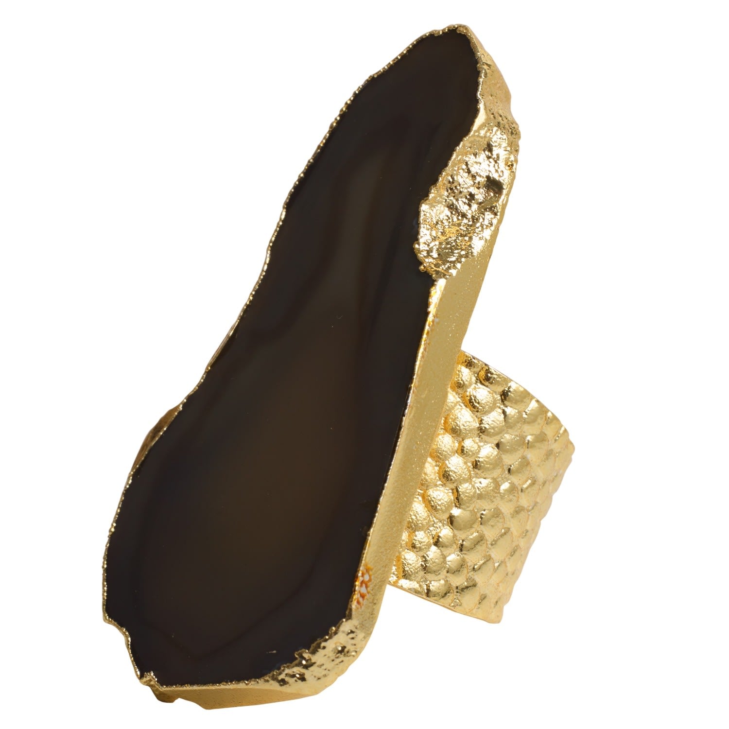 This Ultra Mega Dark Brown Gemstone Gold Statement Ring by Yaa Yaa London is designed for those who want the ultimate statement piece. The striking agate gemstone, unique in its natural shape and color intensity, is beautifully gilded in 18k gold plating. This adjustable ring is guaranteed to attract admiring glances, serving as a reminder of the natural beauty and power that only semi-precious stones can bring. It's an exceptional ring that takes your mind to a happy place.