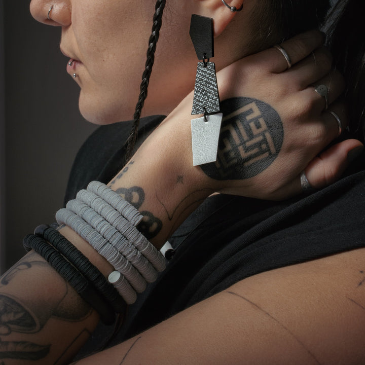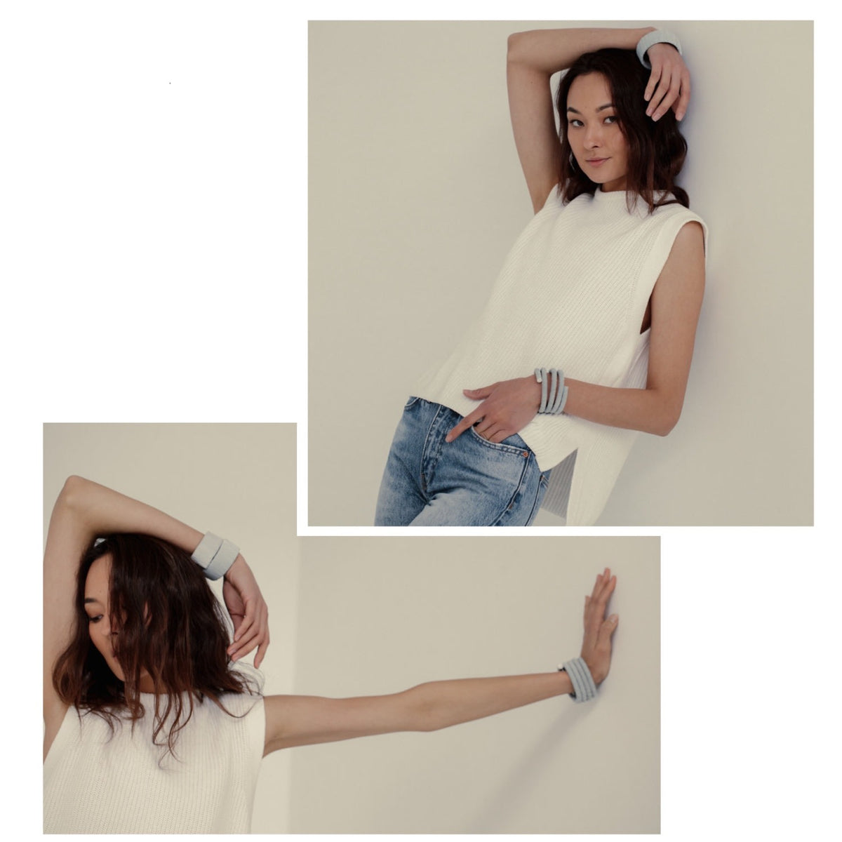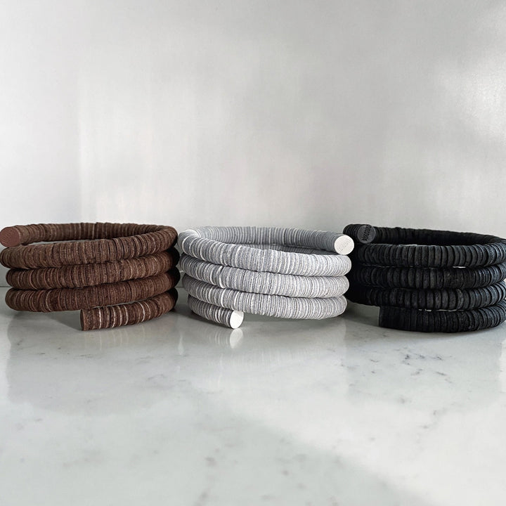 This Continuous Coil Cuff Bracelet by Waiwai is a bold statement piece defined by its high-texture design and simple elegance. Made with individually hand-punched genuine leather discs, it is soft, lightweight, and comfortable for all-day wear. The cuff’s unique, flexible structure allows you to adjust the diameter to fit your wrist perfectly. This is a quiet yet powerful accessory that embraces bold simplicity and artistic craftsmanship, offering a unique and comfortable way to accessorize.