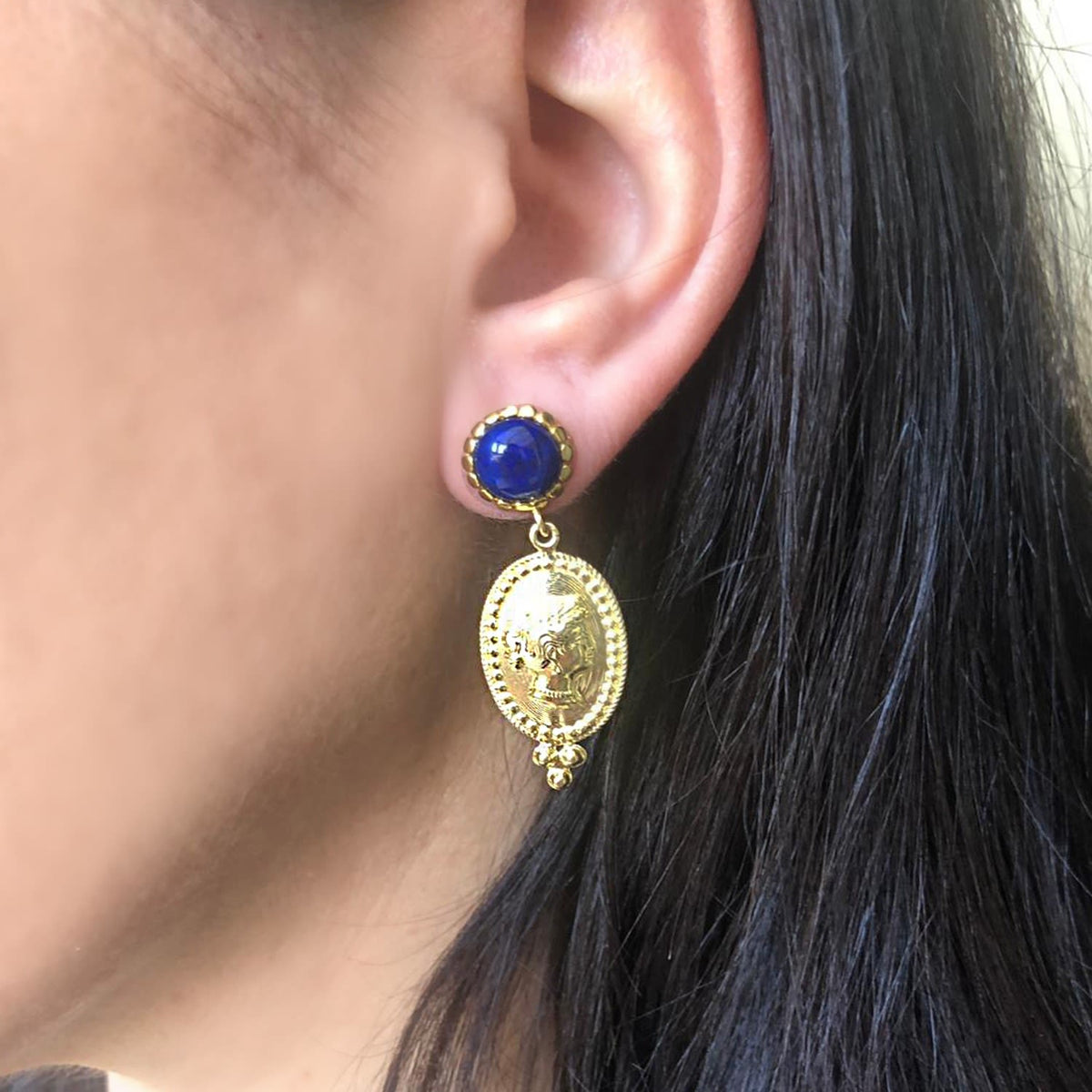 The Cleopatra Lapis Earrings by Vintouch Italy are part of the brand's Roma collection, inspired by the Greco-Roman world. They feature two lapis cabochons and medallions depicting Cleopatra VII, which are handmade by molding an ancient Roman medallion in wax. The earrings are made from 18-karat gold-plated silver and are nickel-free.