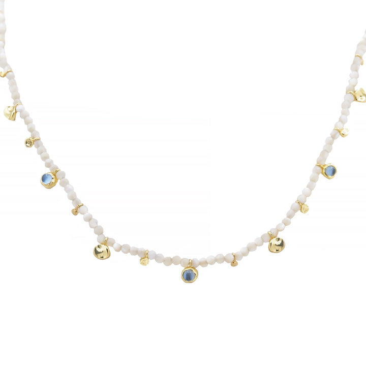 This Maura Necklace In Mother Of Pearl by Marcia Moran is a stunning and elegant accessory. This handcrafted necklace features a beaded design with 18k gold plating over brass, adorned with molten coin accents and delicate small stones. The pieces incorporate natural semi-precious stones, making each necklace a unique, one-of-a-kind piece with its own special texture and color. This necklace is perfect for adding a touch of sophisticated style to your look.
