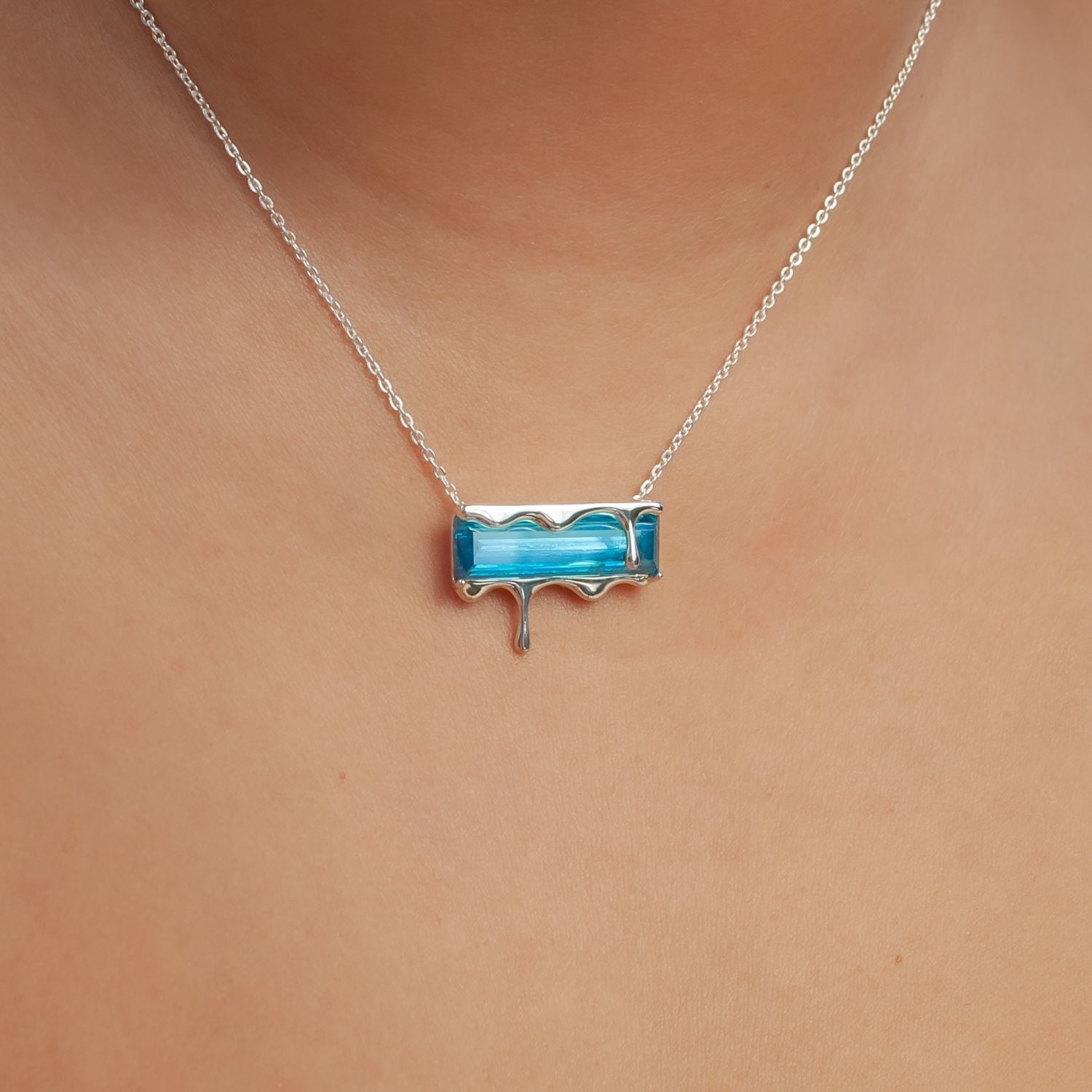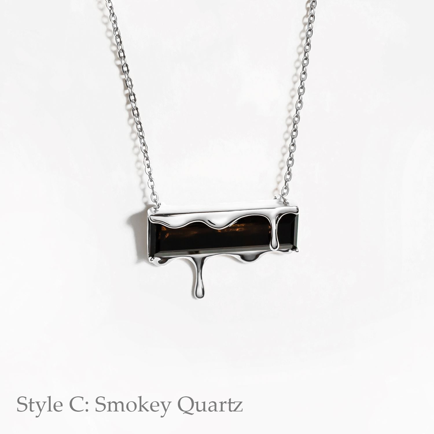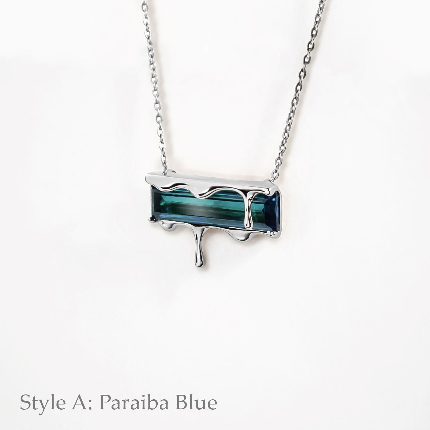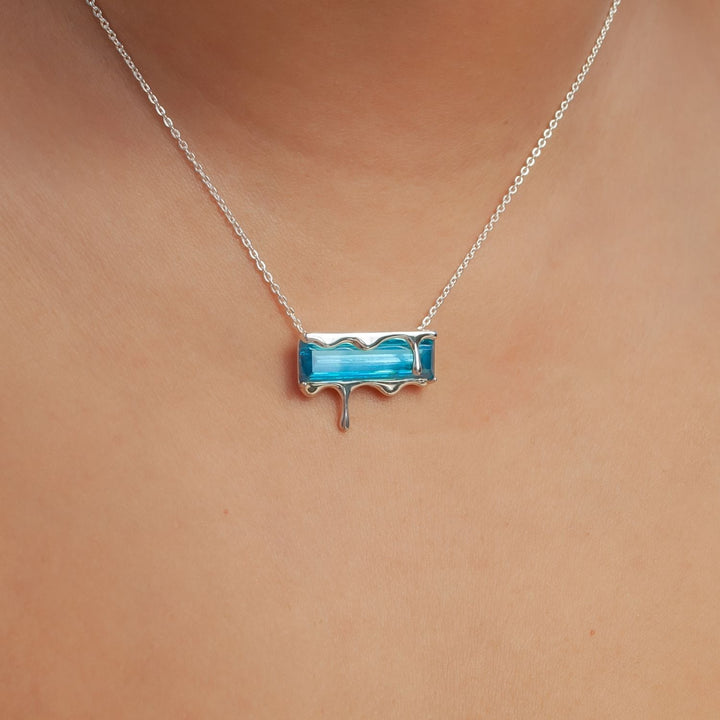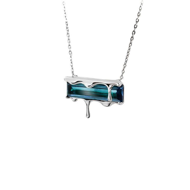 This Dripping Gemstone Sterling Silver Pendant Necklace by Marie June Jewelry is a minimalist jewel that captures the frozen beauty of molten silver in motion. Its sliding pendant moves freely along the chain, adding a sense of flow and versatility. Offered in rich gemstone shades—vivid Paraiba blue zircon, fiery garnet quartz, smoky quartz, and emerald quartz—the piece invites wearers to express individuality through color and symbolism. Sleek, timeless, and versatile, it is a refined addition to any modern jewelry collection.