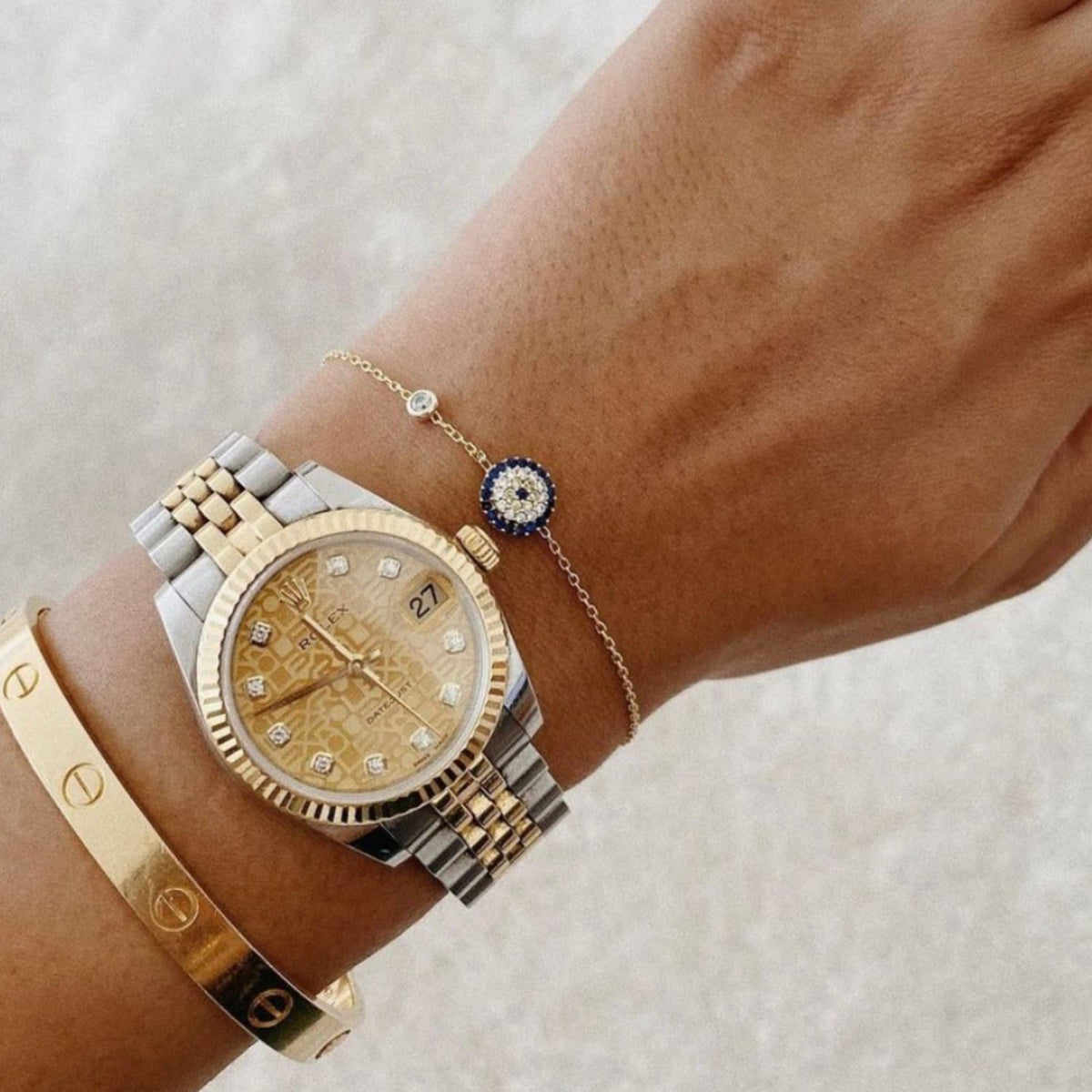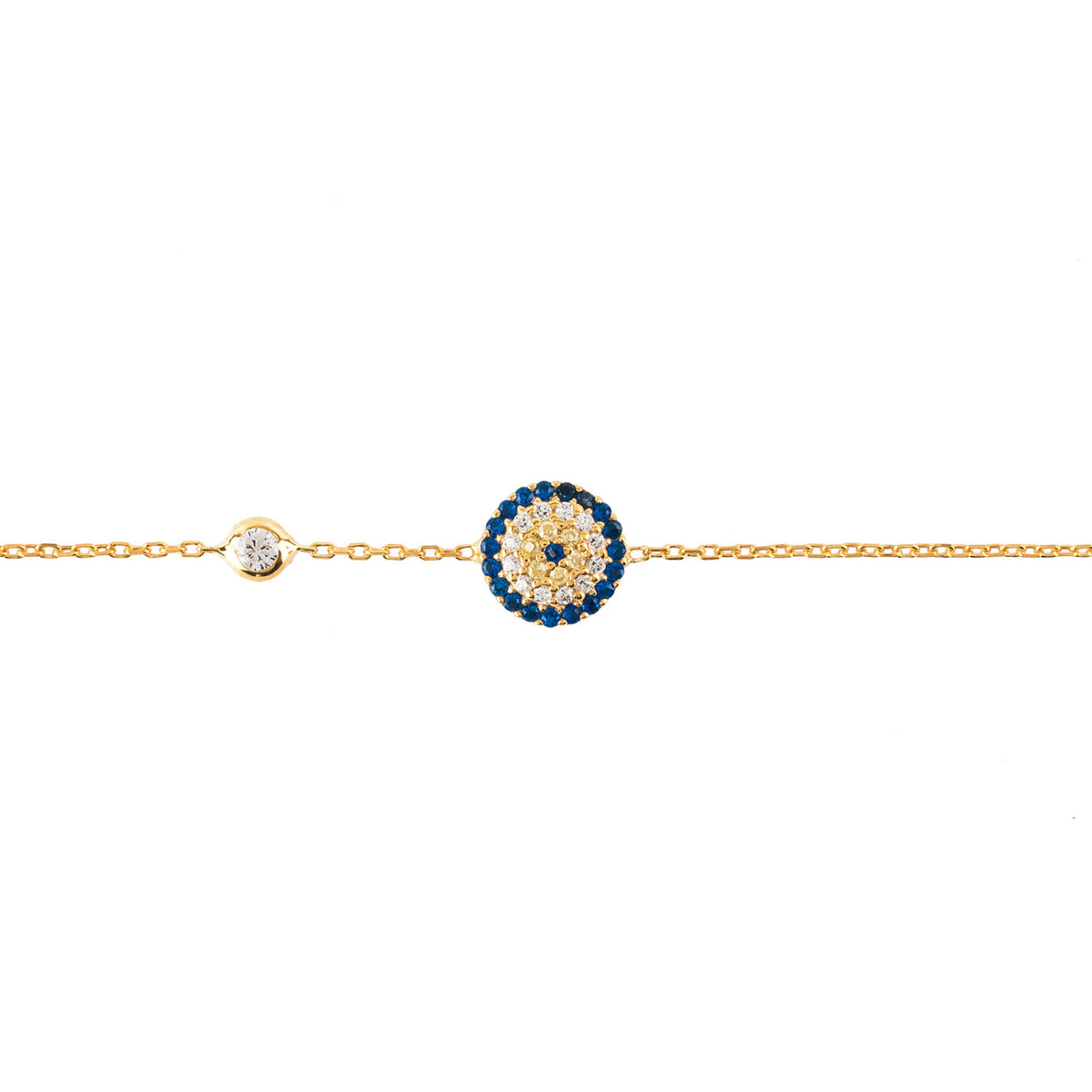 The Evil Eye Bracelet by Latelita in Gold is a simple yet chic accessory. It is handcrafted from sterling silver and adorned with faceted blue and white zircons. The evil eye is a talisman believed to protect against misfortune.
