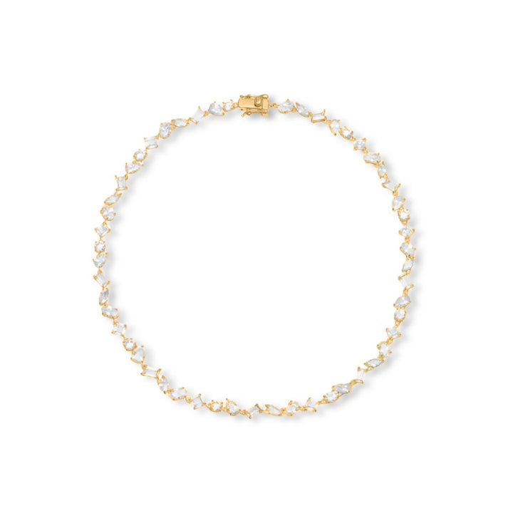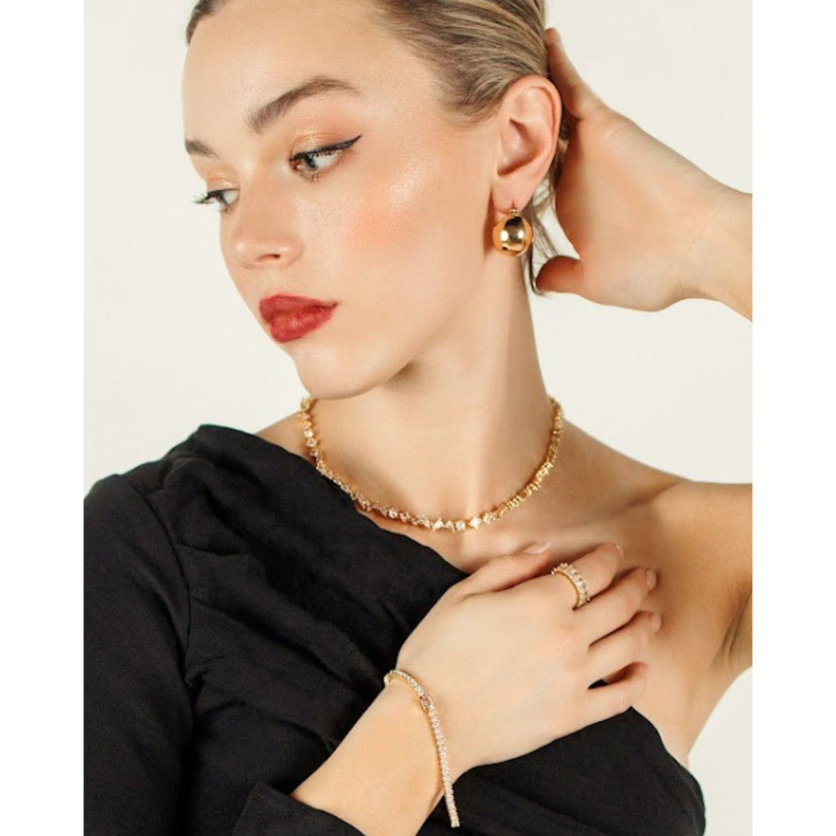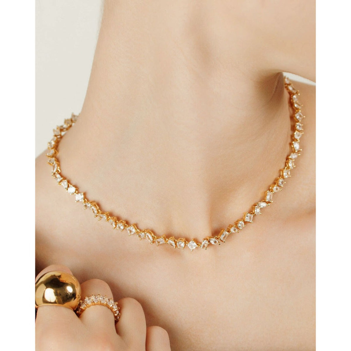 The Carina Multiple Cut Zirconia Stone Necklace by Viea is a sparkling and captivating accessory. It features a stunning zirconia stone that is meticulously cut into various shapes, creating a mesmerizing display of brilliance. The necklace is made from 18k gold plated brass and is hypoallergenic and waterproof. It has an elegant open-box clasp.