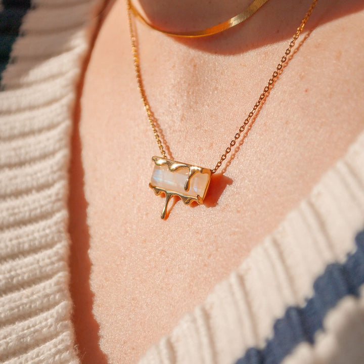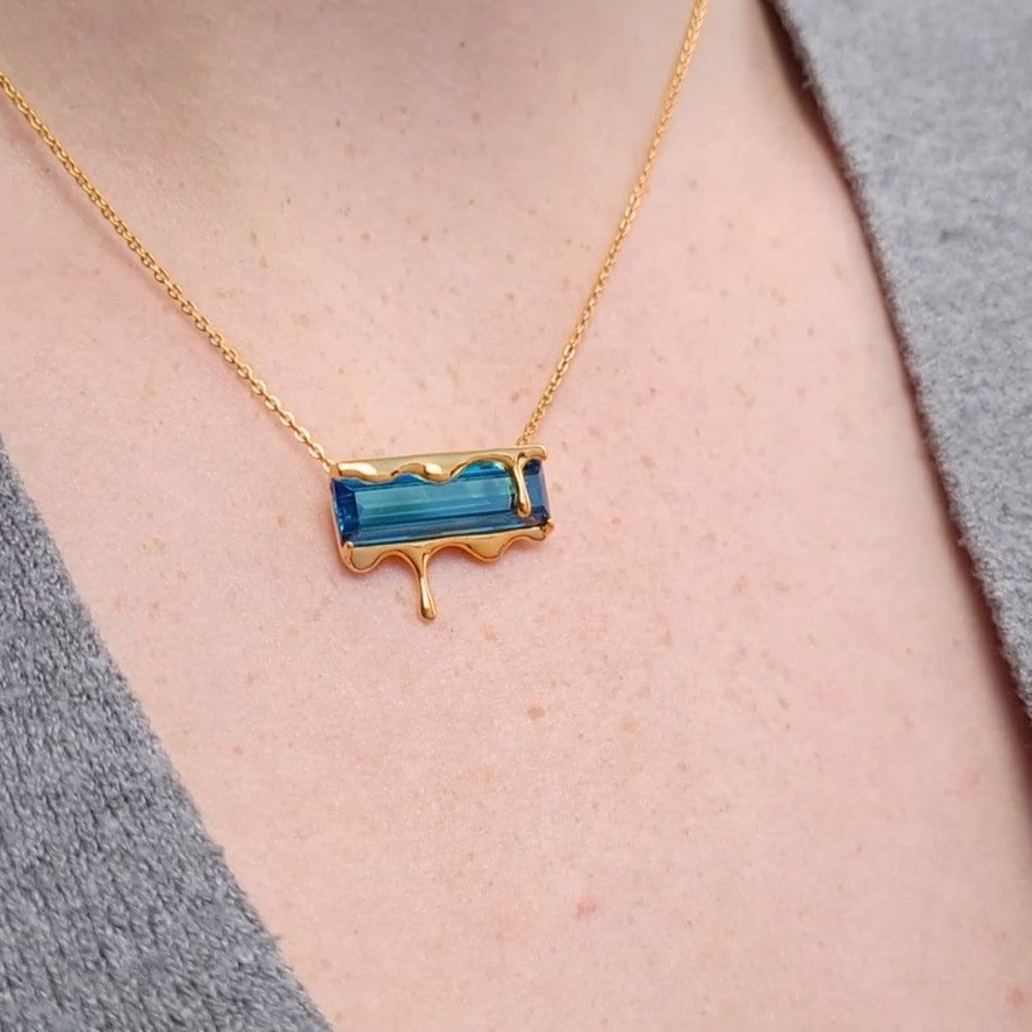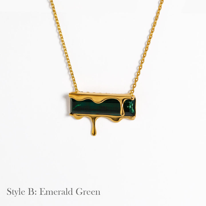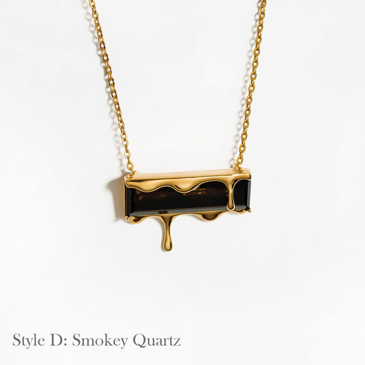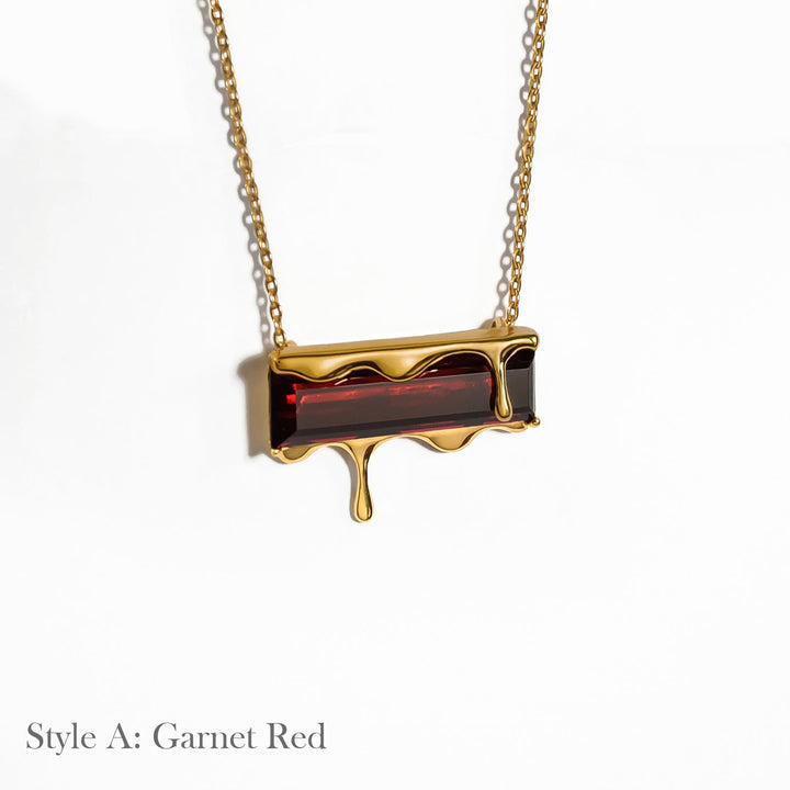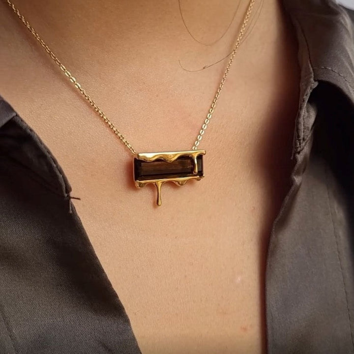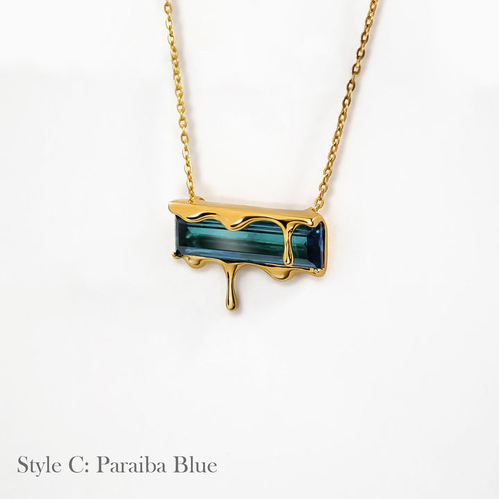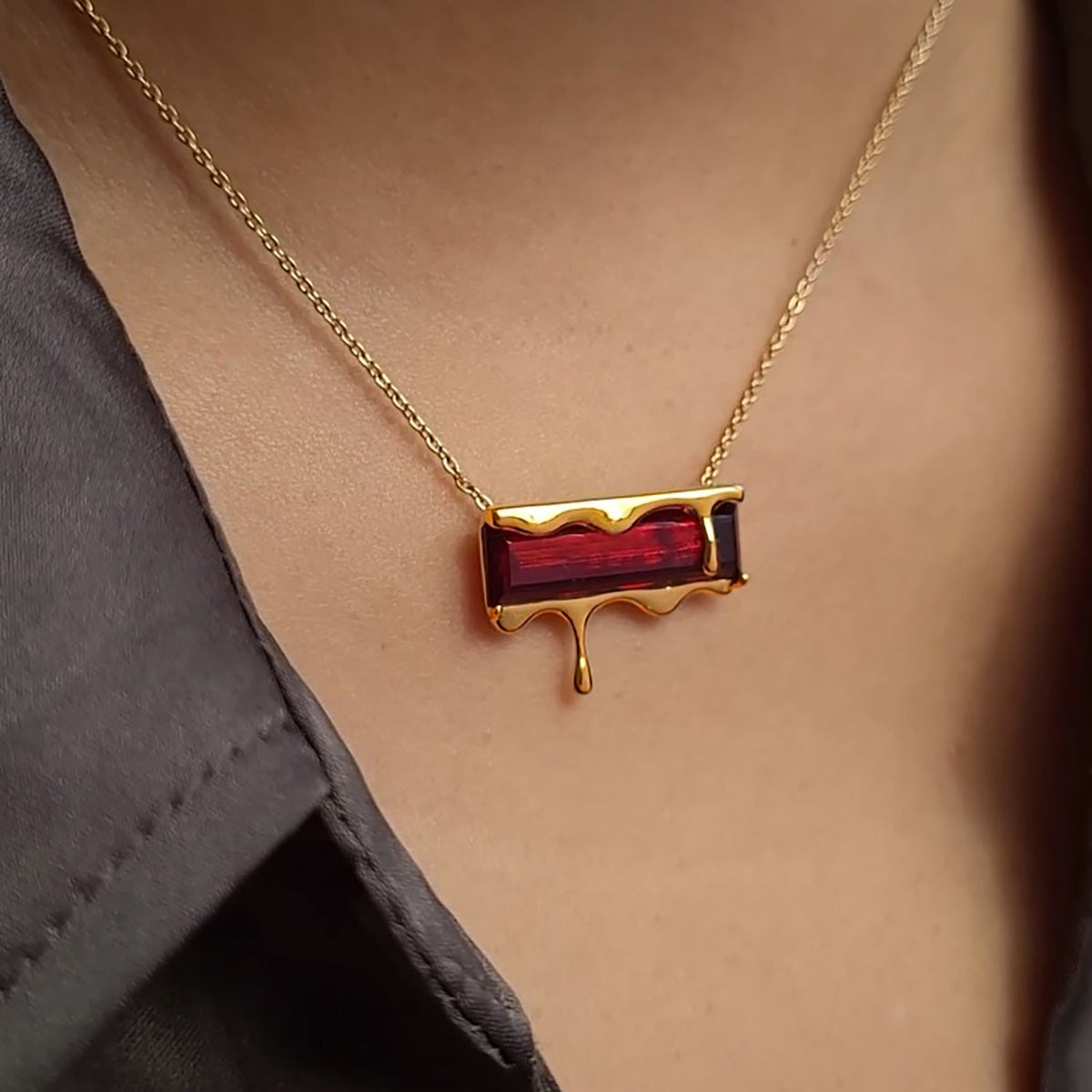 This Dripping Gemstone Gold Vermeil Pendant Necklace by Marie June Jewelry is a radiant play on fluid elegance and personal expression. Its free-moving pendant, designed to glide along the chain, reflects the essence of molten metal captured in motion. Offered in striking gemstone colors—from passionate garnet red to luminous moonstone, Paraiba blue zircon, emerald quartz, and smoky quartz—each variation tells its own story of energy, mystery, and transformation. Minimalist yet expressive, this necklace brings a pop of color and timeless symbolism, perfect for everyday wear or as a meaningful gift.