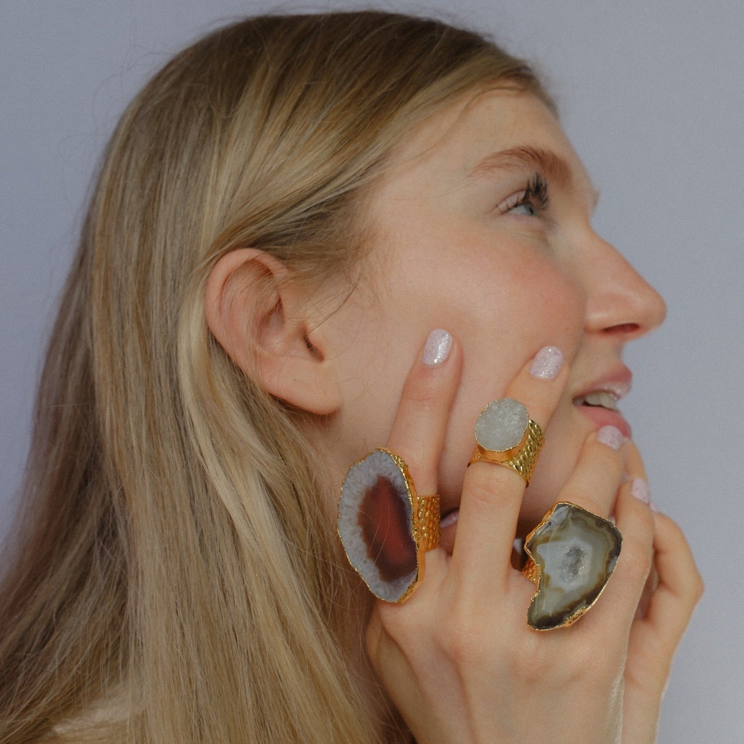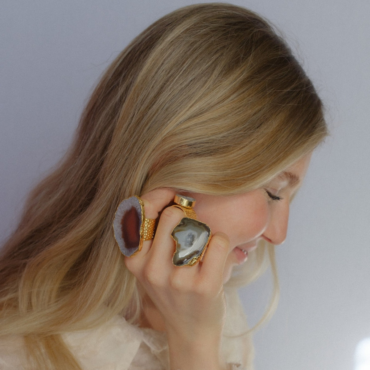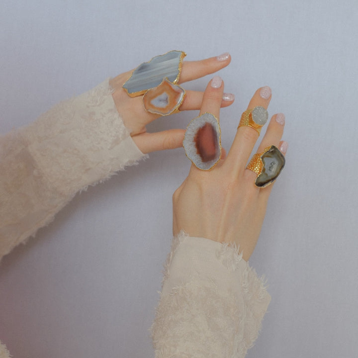 Handmade with natural agate stone, 18K gold, and brass. Adjustable design. Each stone unique in shape, size, and color.