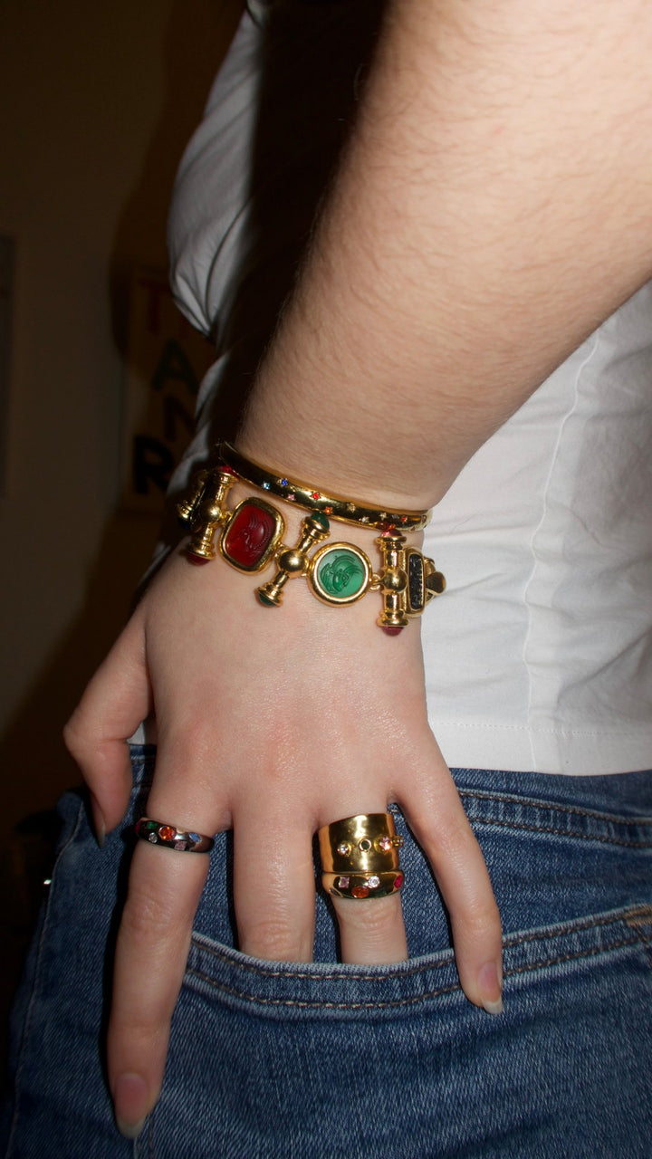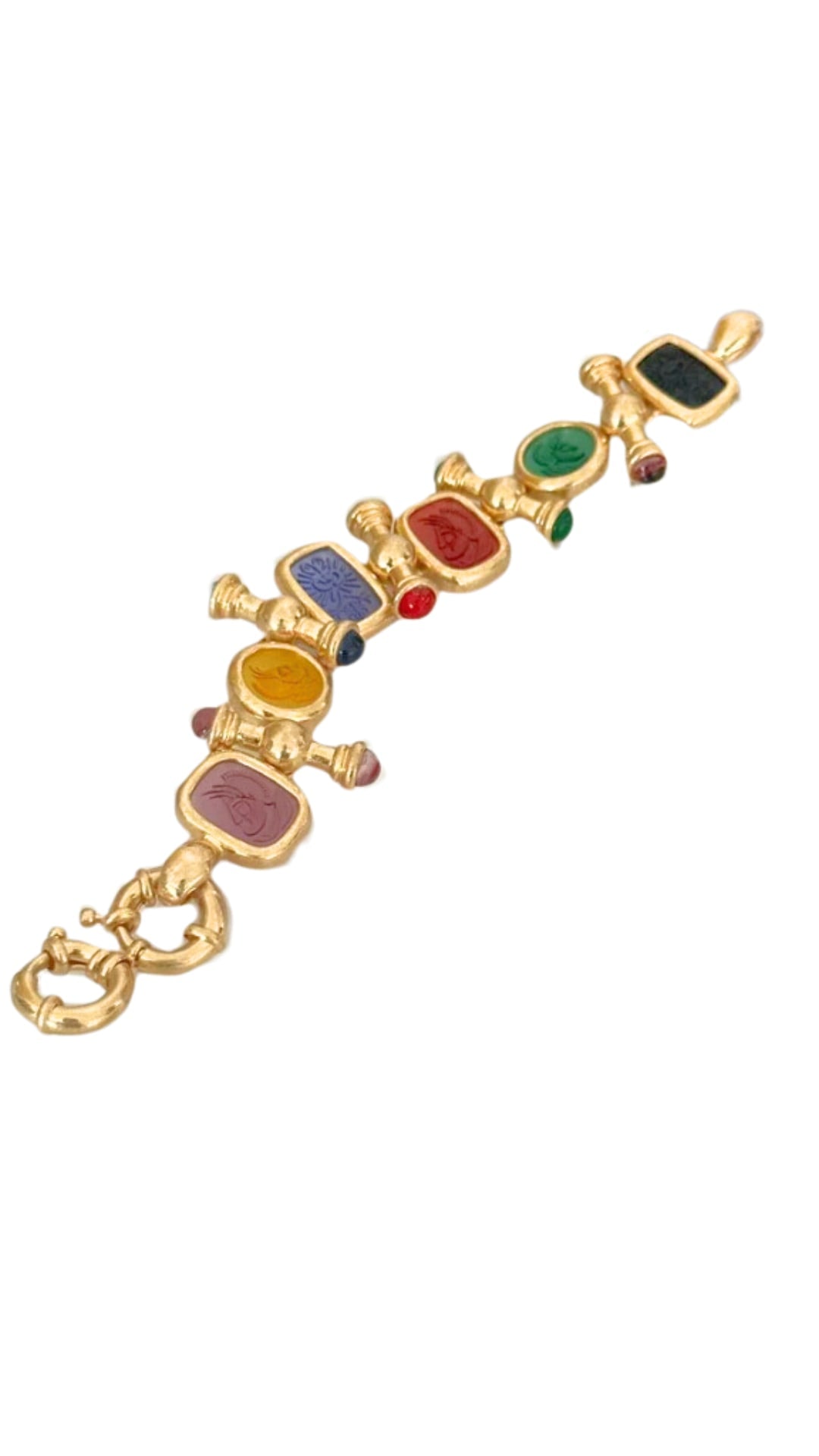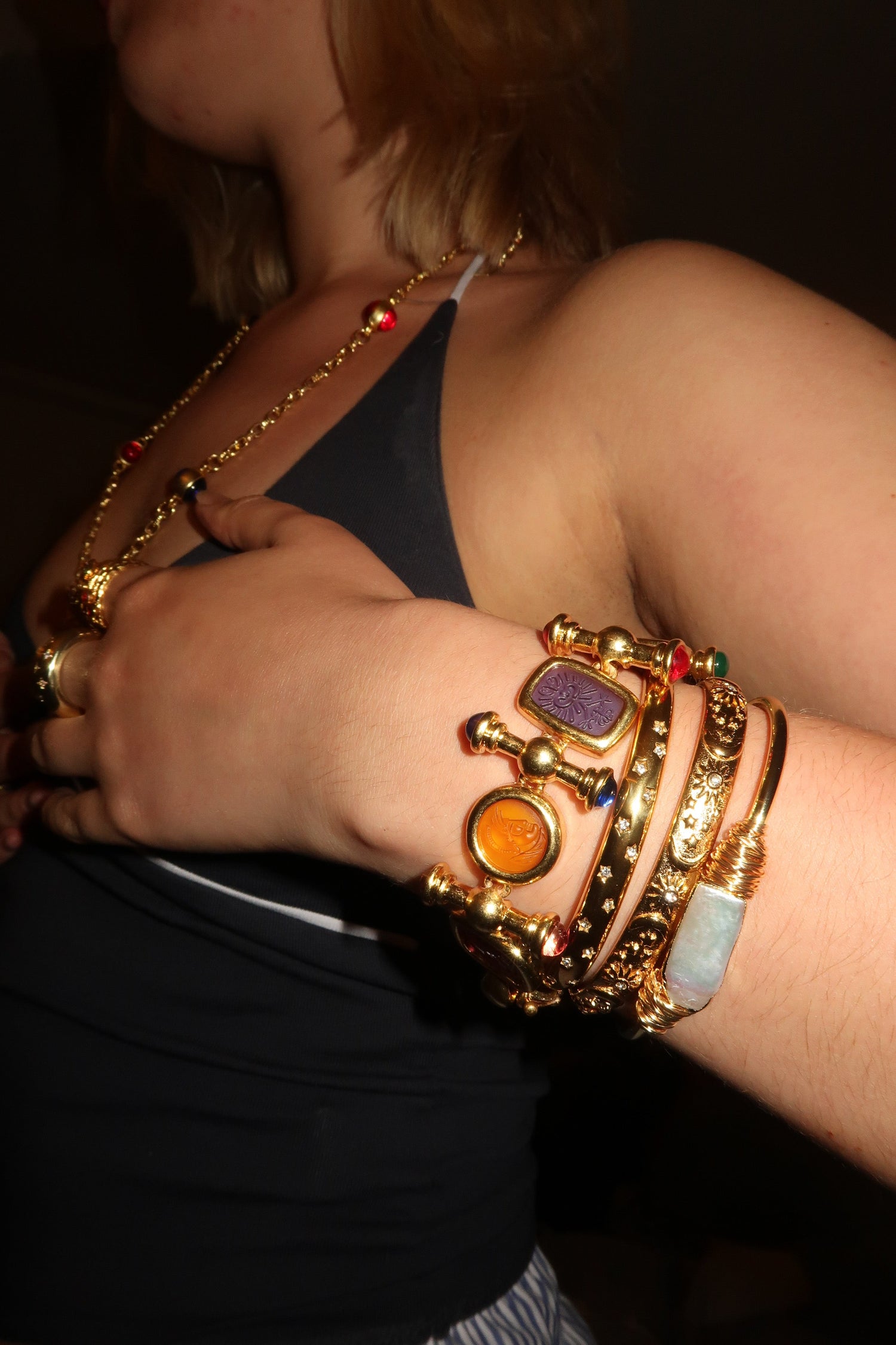 This Aurora’s Charm Bracelet by Recreation Jewels is the ultimate statement piece that seamlessly marries vintage charm with a burst of modernity. It features an eclectic mix of blue, red, green, black, purple, and orange charms, allowing you to embrace your individuality and stand out in style. It is a symbol of confident and playful fashion, offering an affordable luxury that makes a unique statement without compromising on quality.