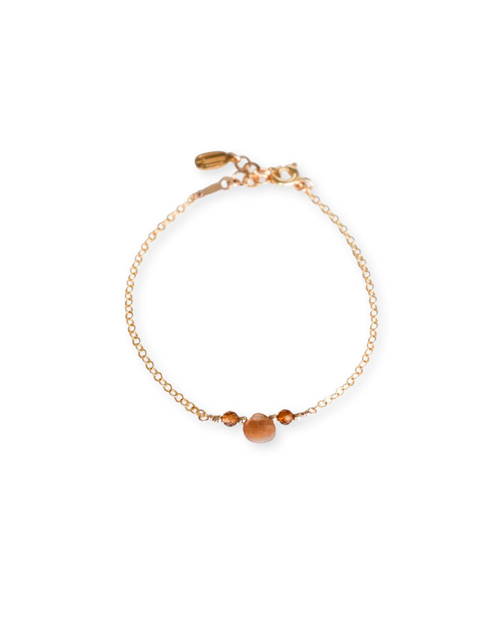 This bracelet is crafted from 14k gold-filled material. It is set with natural golden moonstone and brown tourmaline gemstones.