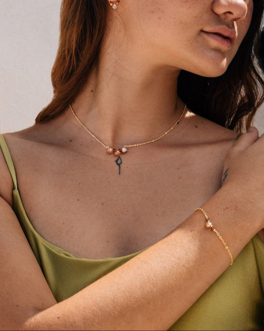 This Golden Hour Bracelet by Inari Jewellery brings a subtle sparkle and earthy warmth to your wrist. It features a beautiful combination of natural brown tourmaline and glowing golden moonstone gemstones on a fine gold-filled chain. This hypoallergenic and tarnish-resistant bracelet is perfect for layering with other pieces or wearing on its own for a touch of everyday elegance.