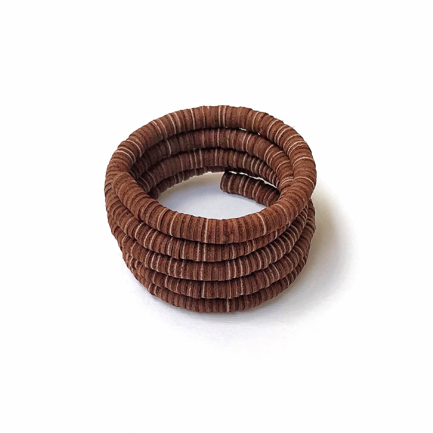 This Continuous Coil Cuff Bracelet - Brown by Waiwai is a bold statement piece that combines simplicity with high texture. Made with individually hand-punched genuine leather discs, it is soft, lightweight, and quiet, ensuring cozy, comfortable all-day wear. The adjustable diameter allows it to fit any wrist, or it can be stretched out for an imaginative, unique look. This bracelet is a celebration of craftsmanship and a sophisticated addition to your accessory collection.