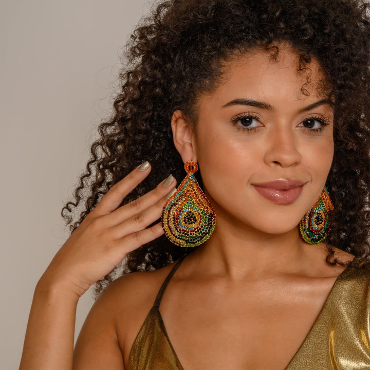 These Multicolor Aria Maxi Handmade Earrings by Lavish by Tricia Milaneze celebrate colour and craftsmanship. Hand-crocheted teardrop forms shimmer with multicoloured crystals and beads, creating a vibrant, lightweight statement piece. Unique and artisanal, they embody joy and individuality in every stitch.