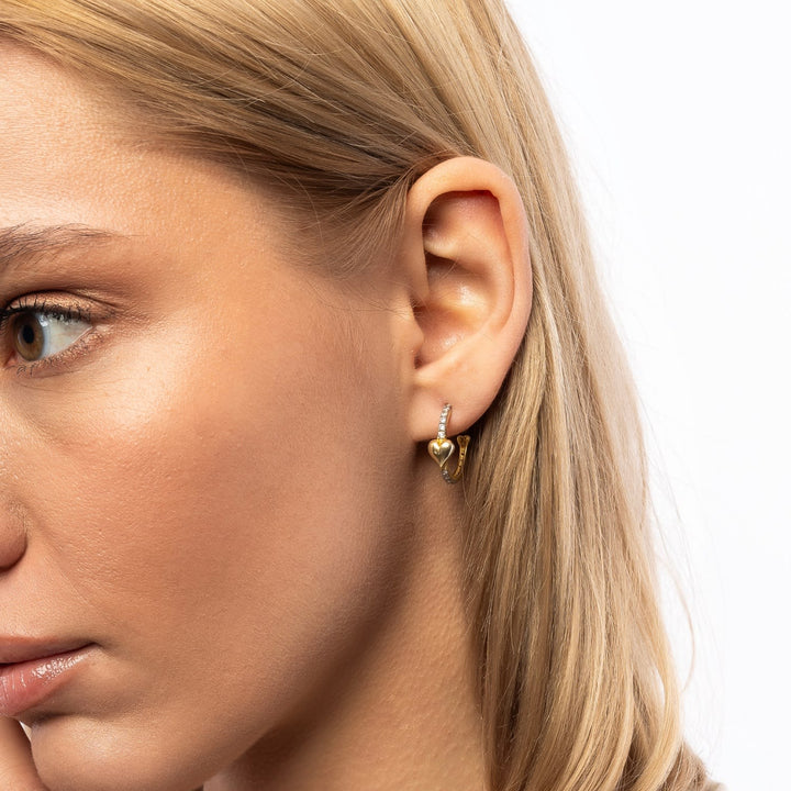 These hoop earrings are made from recycled 925 sterling silver with a gold tone. They feature a heart design paved with shimmering cubic zirconia and a post-back lock.