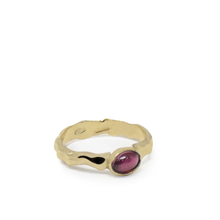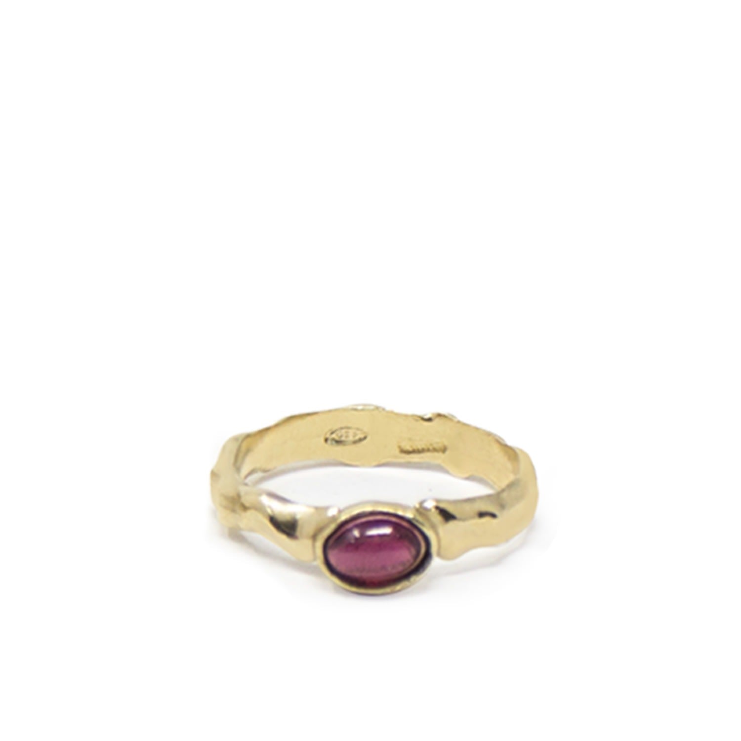 This ring is handmade from 18 karat gold over sterling silver (1 micron thickness) and features a vibrant rhodolite garnet stone. A 0.10 micron palladium plate is applied for anti-oxidation. Avoid contact with soaps and other chemical substances.