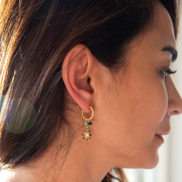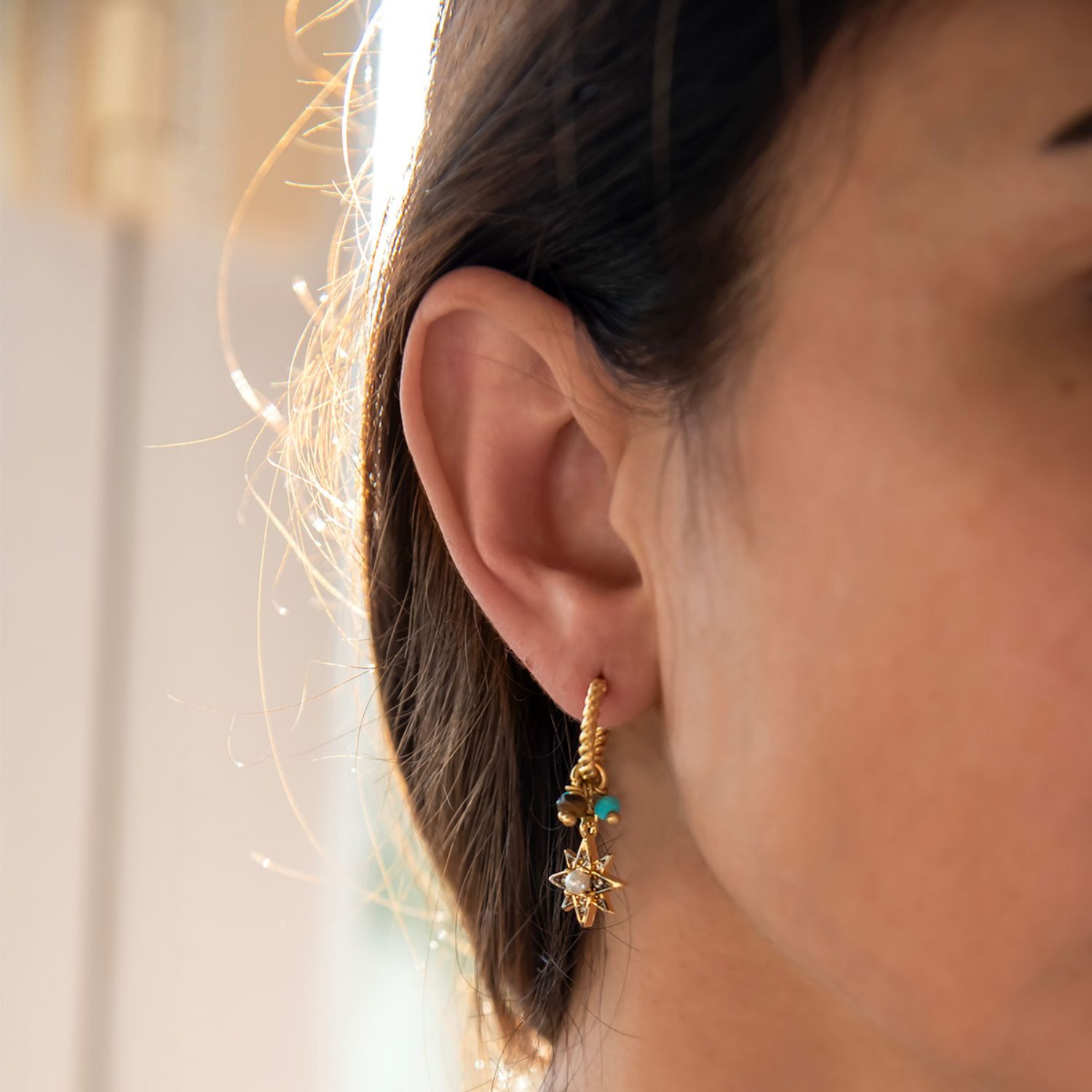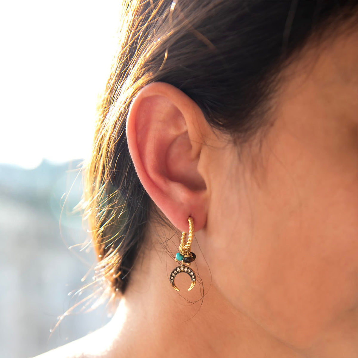 These earrings are crafted from brass with a 24K gold micron finish and feature natural tiger's eye, turquoise, and pearl accents. The design is asymmetrical with a dangling moon and a star.