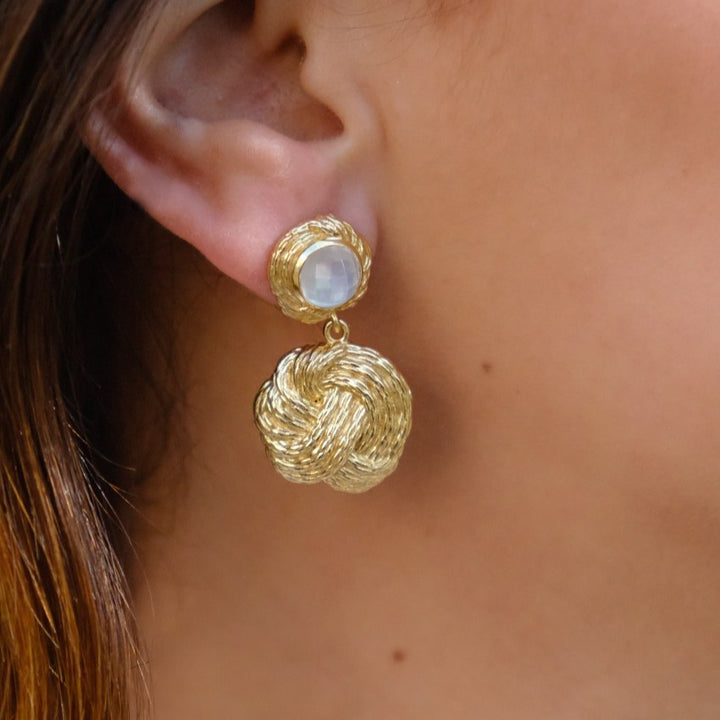 Handmade in 18ct gold-plated brass with rope-textured detail. Features rose quartz doublet stones (Mother of Pearl base with crystal overlay). Drop earring design.