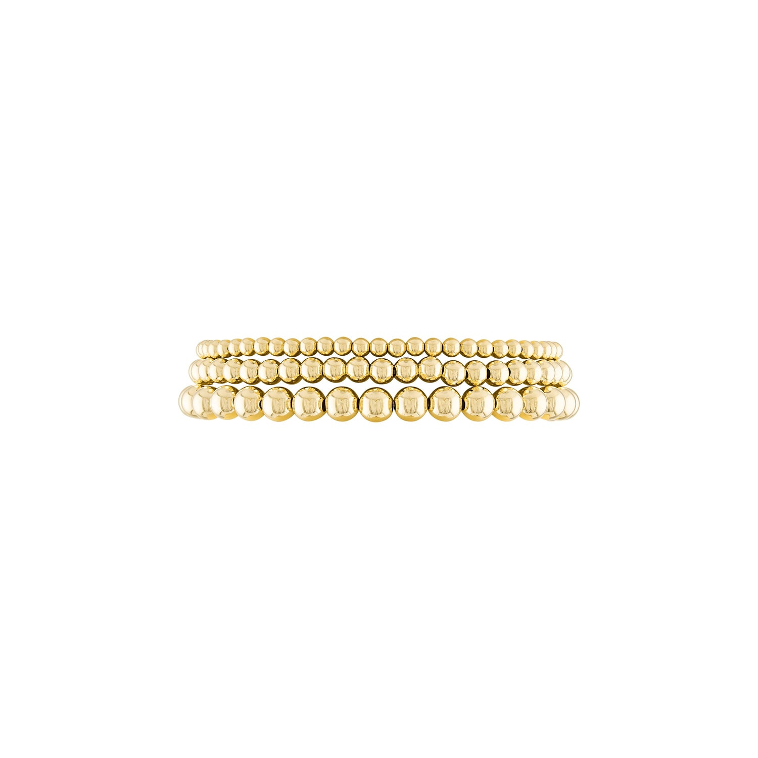 This set includes three bracelets made from 14K gold-filled beads in 3mm, 4mm, and 5mm sizes. The bracelets are handmade and available in a 6.5" length.