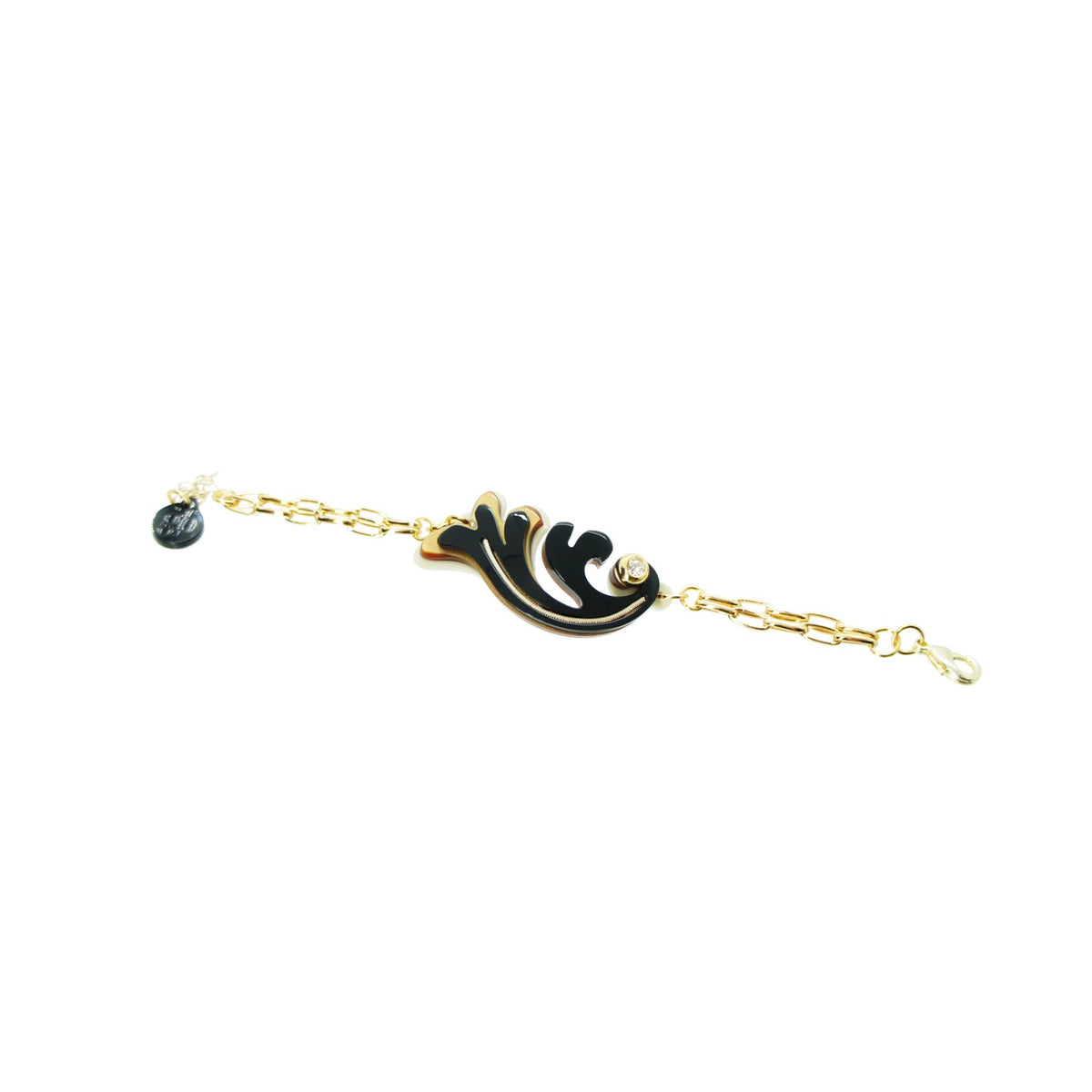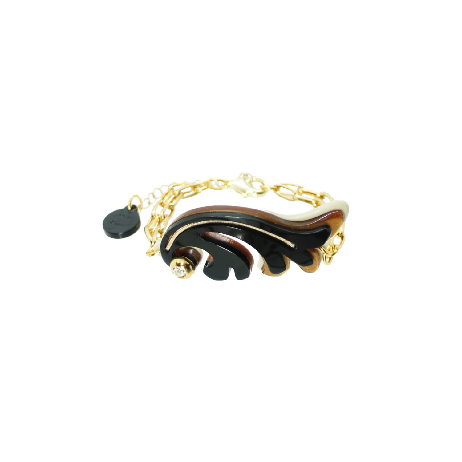 This bracelet is handmade from acrylic. It features glass rhinestones, zamak pieces, and a golden finished brass chain. It is available in sizes XS/S/M/G.