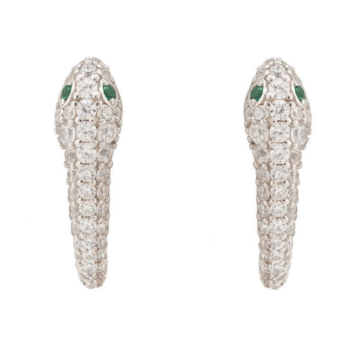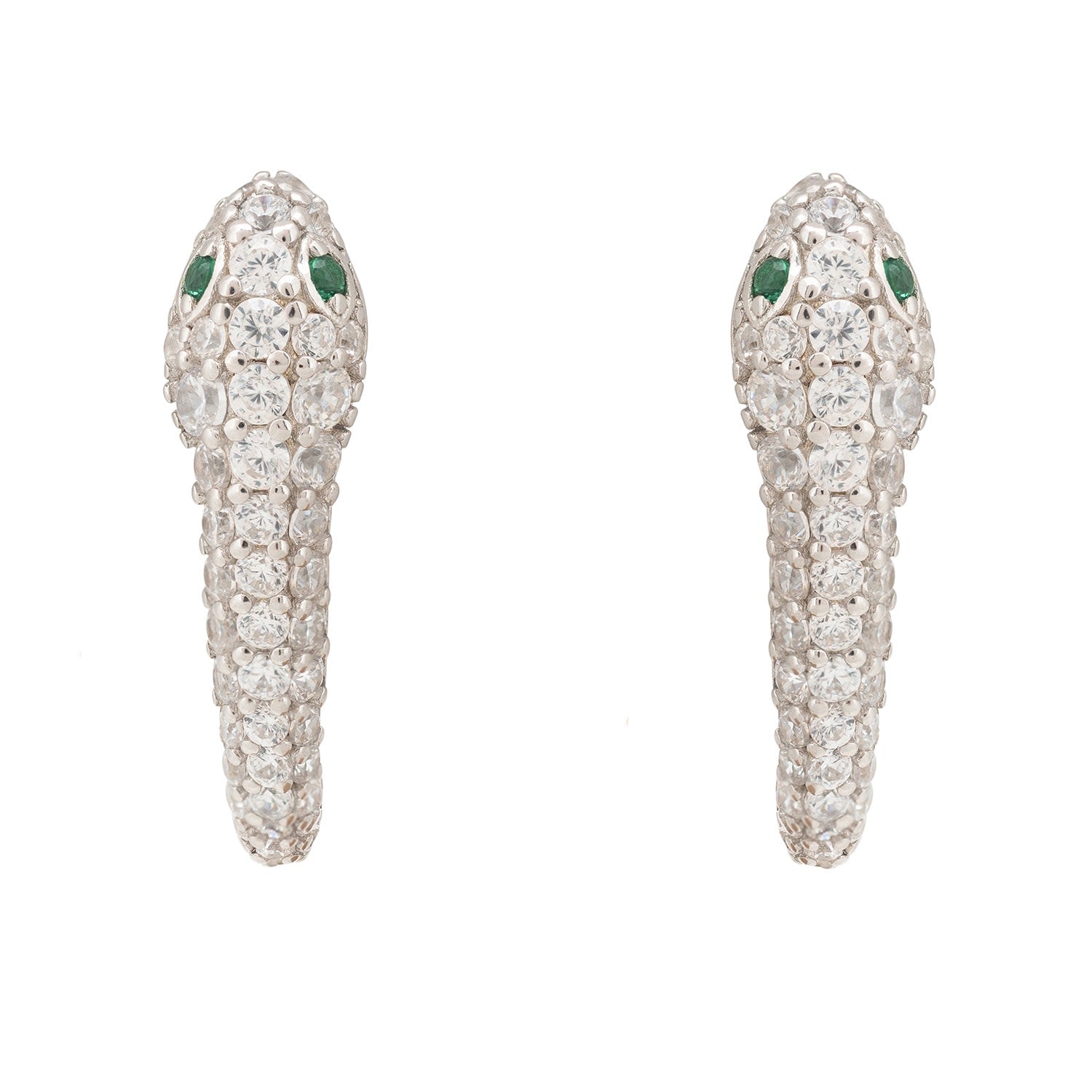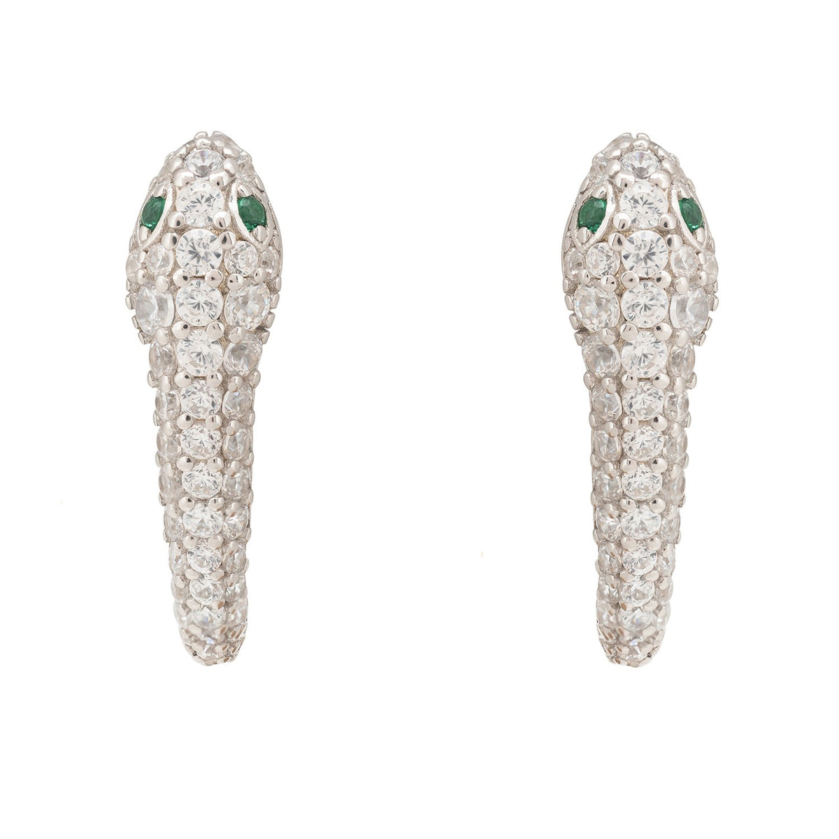 These Snake Huggie Hoops by Latelita are a beautifully styled and symbolic accessory perfect for day-to-night wear. The oval-shaped huggie hoops are cleverly designed to look like a snake has curled up behind your ear. They sparkle with handset white zirconia and have green zirconia eyes, creating an elegant and unique look. Snakes are a powerful symbol of transformation and rebirth, as they regularly shed their skin, adding a meaningful touch to this delicate piece.