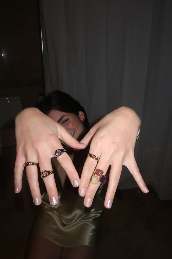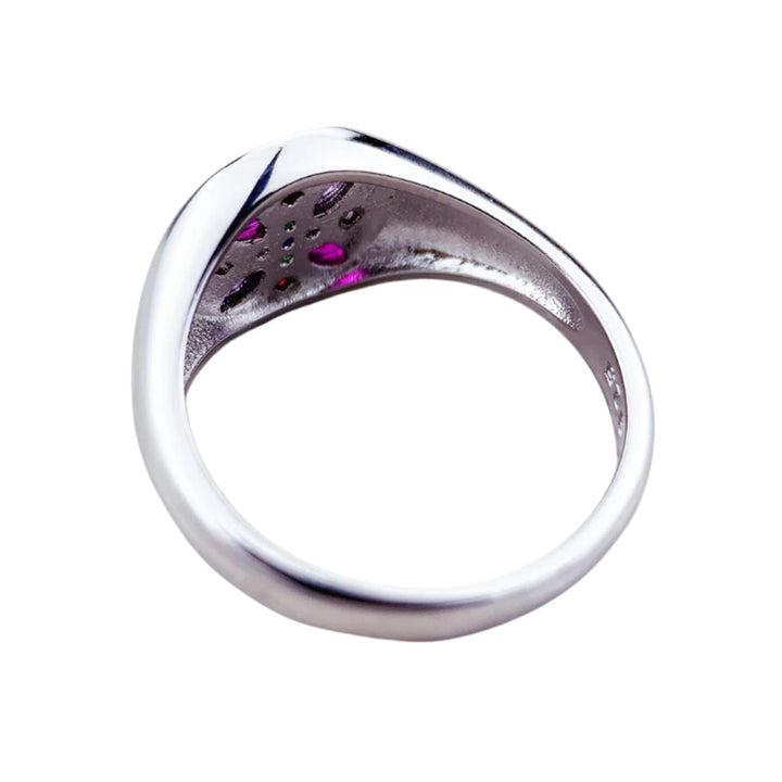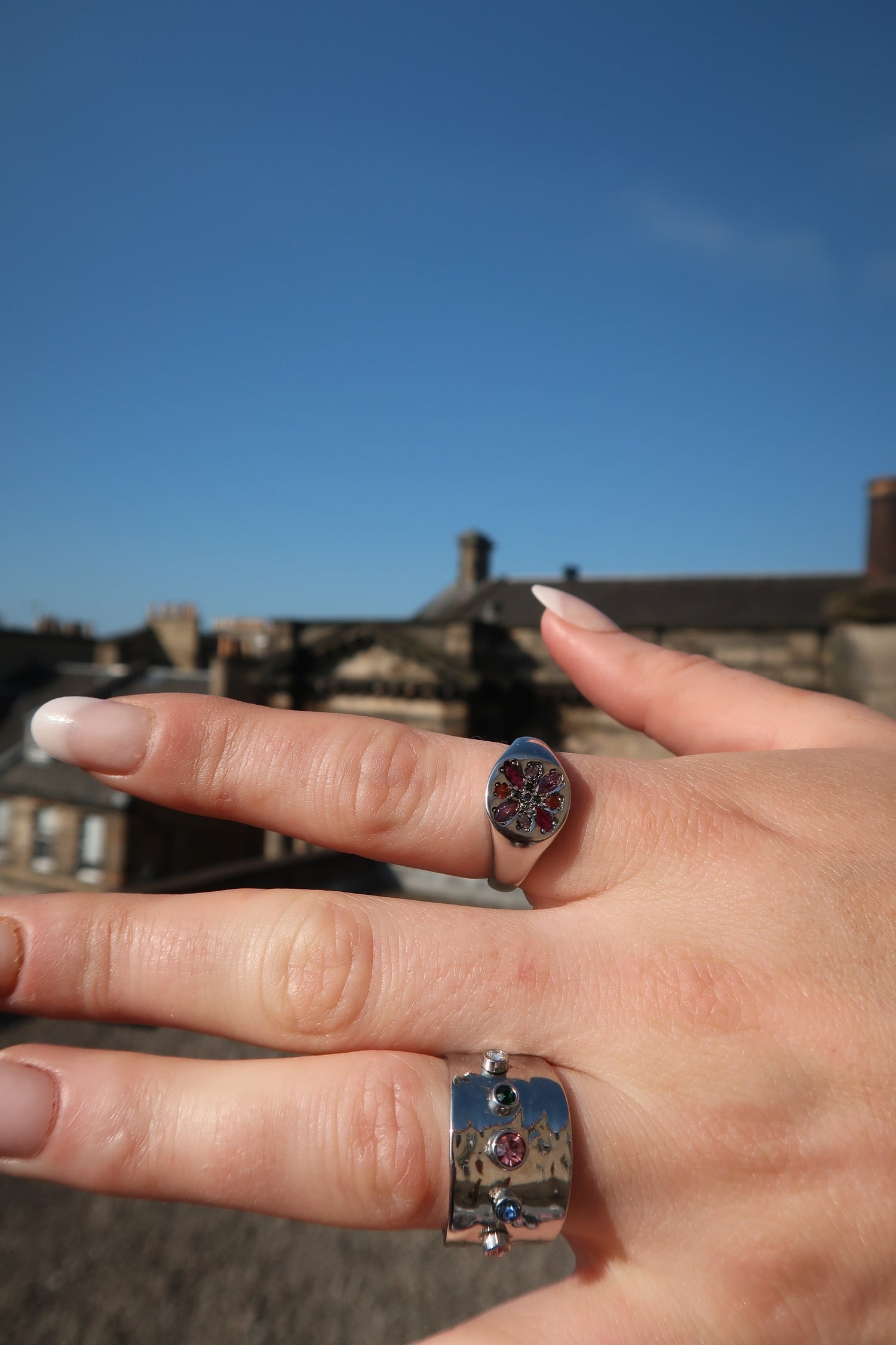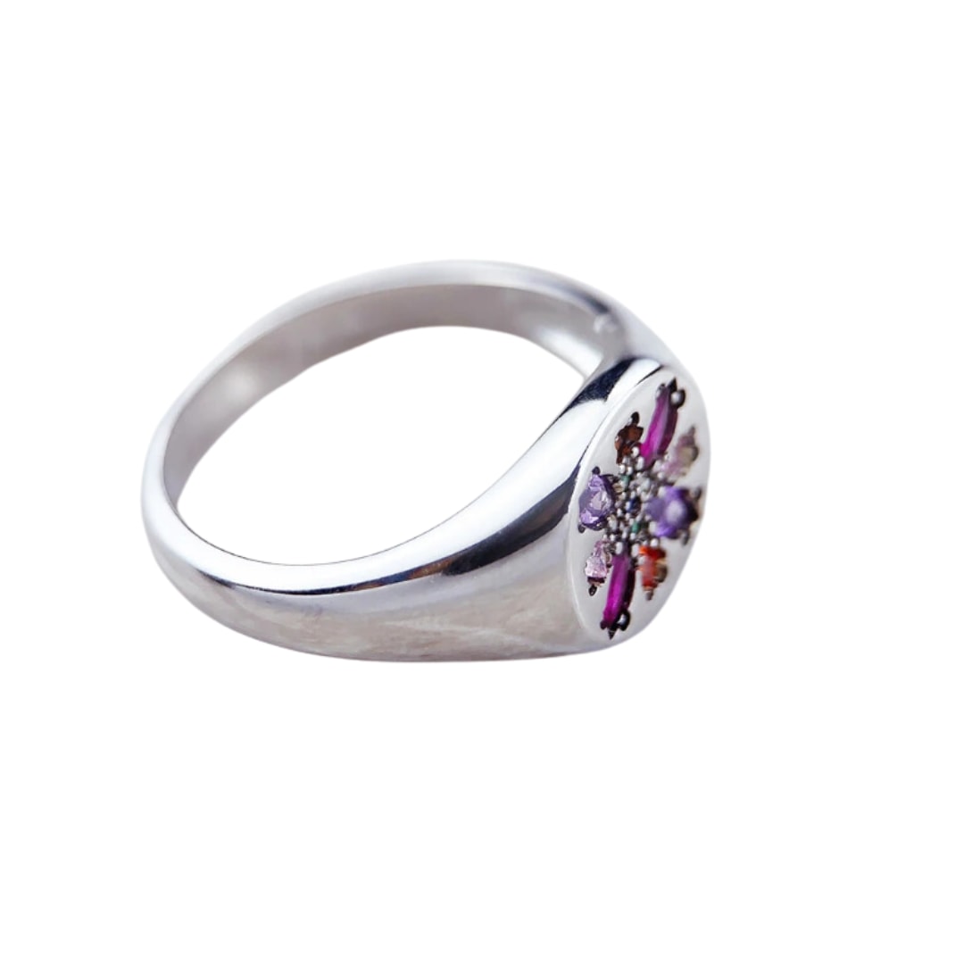 This signet ring is made from water-resistant and hypoallergenic 925k sterling silver and features a vibrant array of multi-colored gemstones.