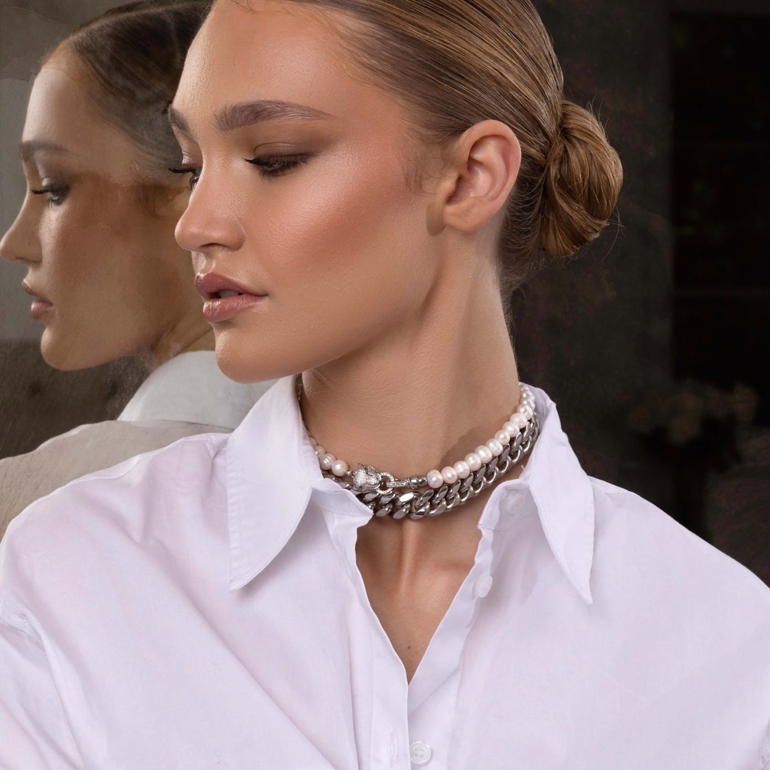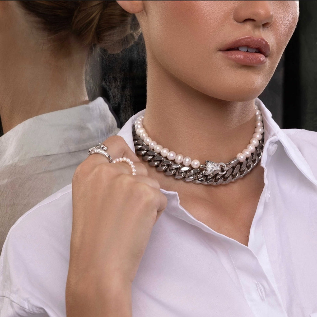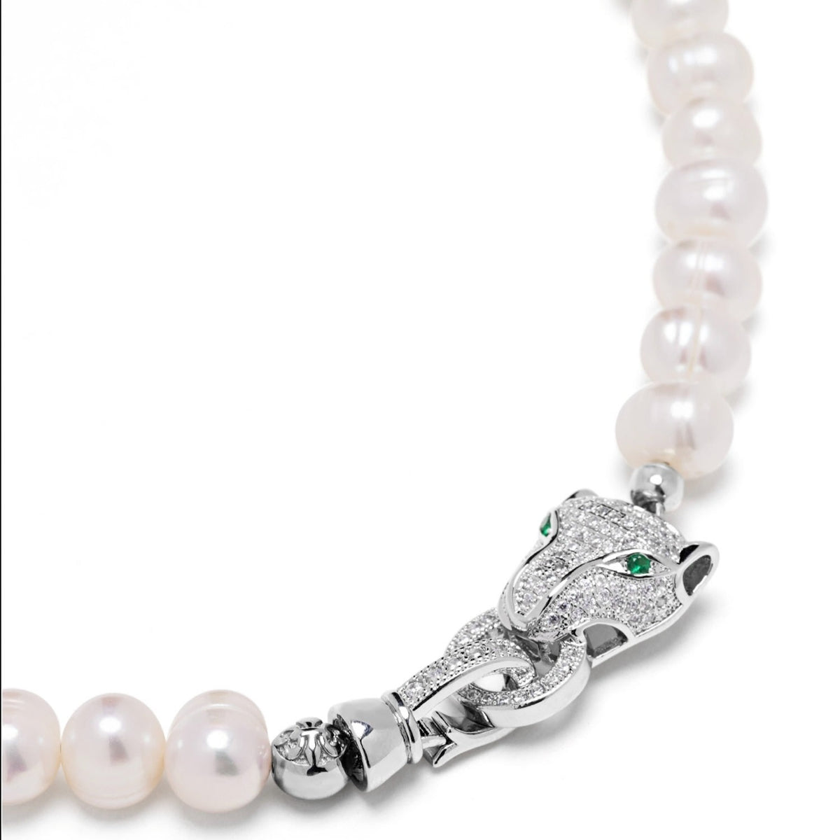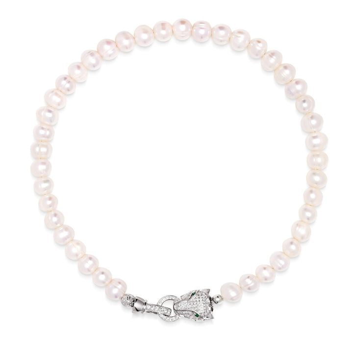 This Women's Pearl Choker With Silver Panther Head by Nialaya is a unique and elegant accessory. It is strung by hand with beautiful 8mm pearls on a strong metal wire. The lock is a panther head made of stainless steel and adorned with clear and green cubic zirconia. The panther is a symbol of protection, guardianship, courage, and strength.