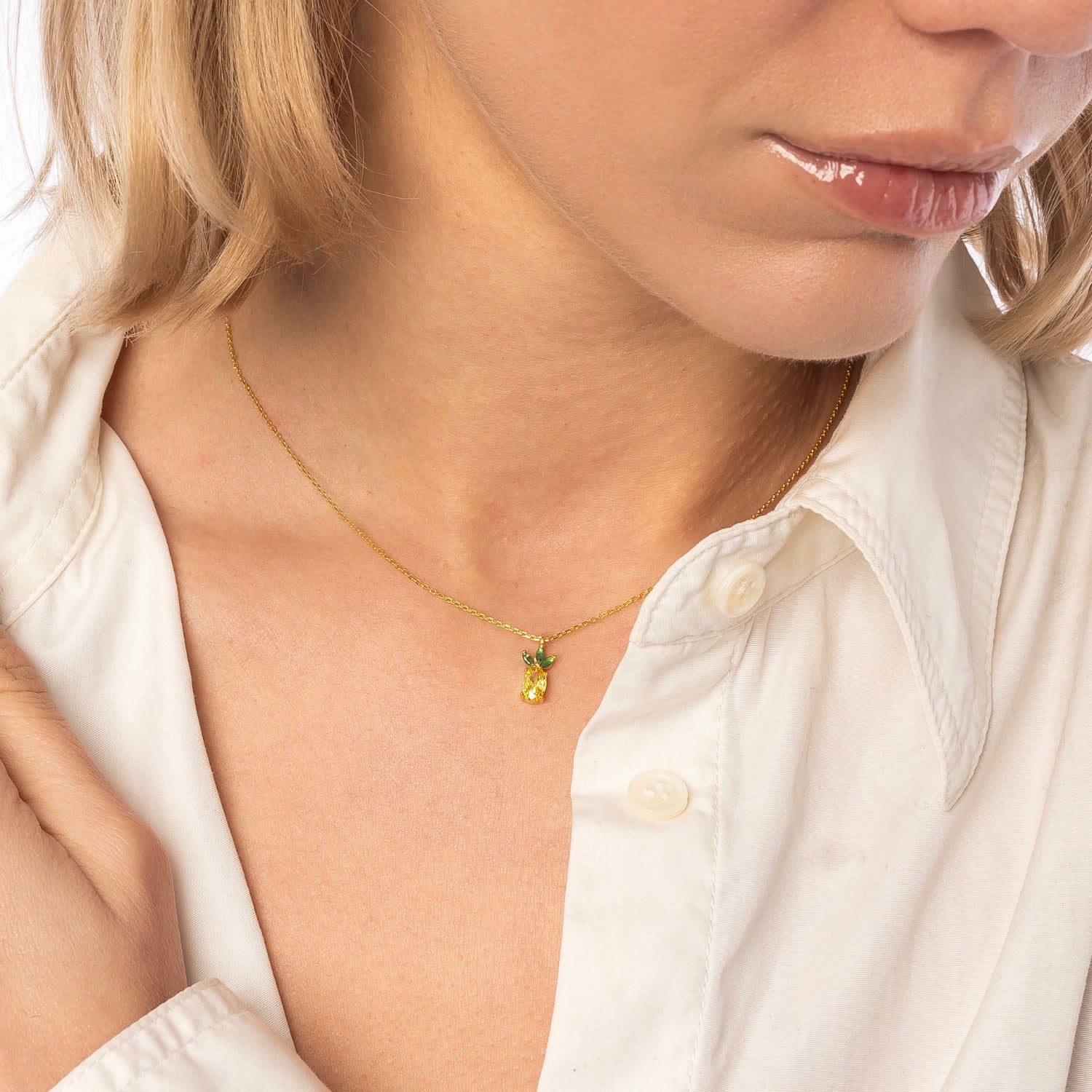 This necklace is made of 100% Fine Sterling Silver. It features a pineapple charm and is 16 inches long with a 1.5-inch extender. The pendant is 11mm in length and 6mm in width.
