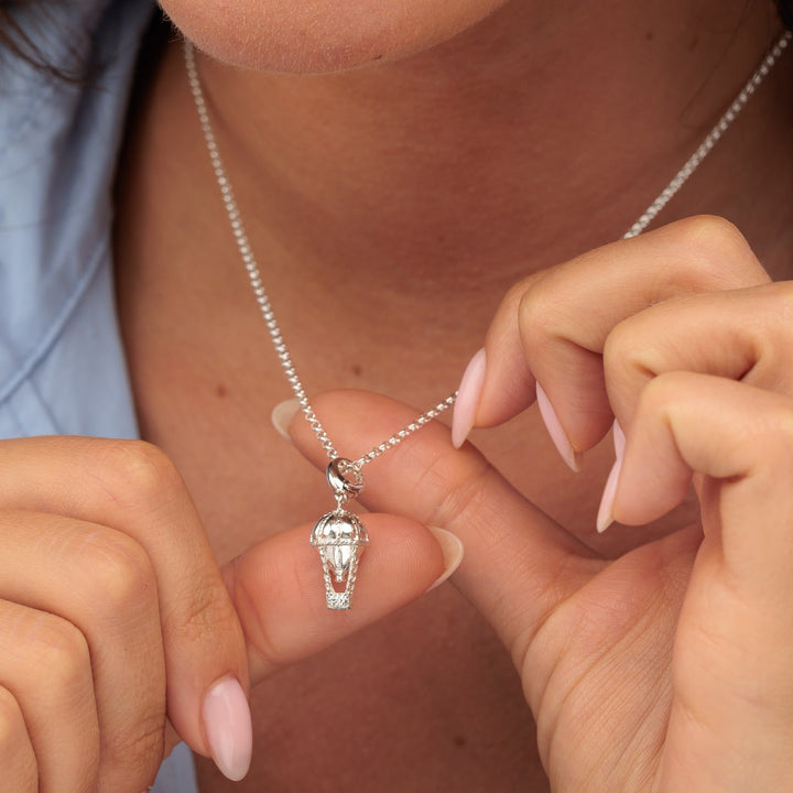 This necklace is crafted from 100% recycled 925 sterling silver and features a beautifully detailed 3D horse charm. The charm attaches with a clip-on clasp and is compatible with other charm brands. (Note: The product description text is inconsistent, describing a horse charm instead of a hot air balloon.)